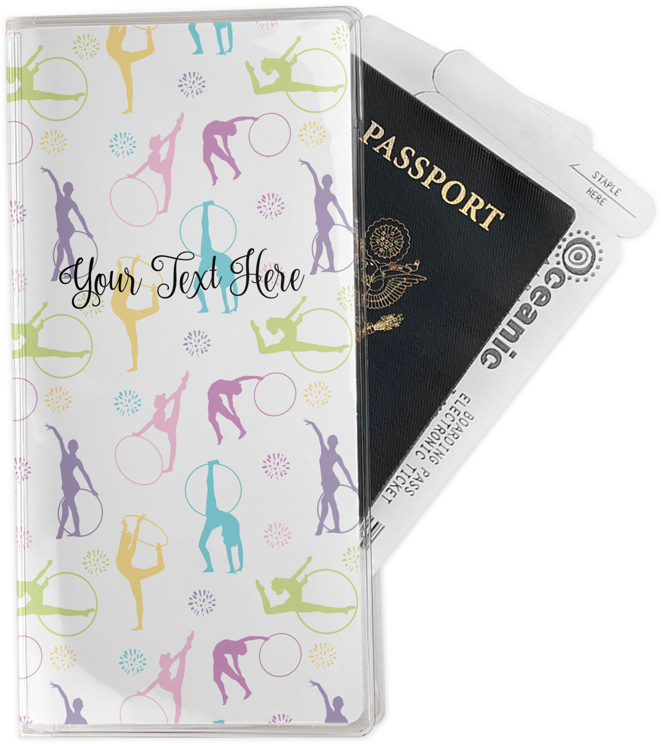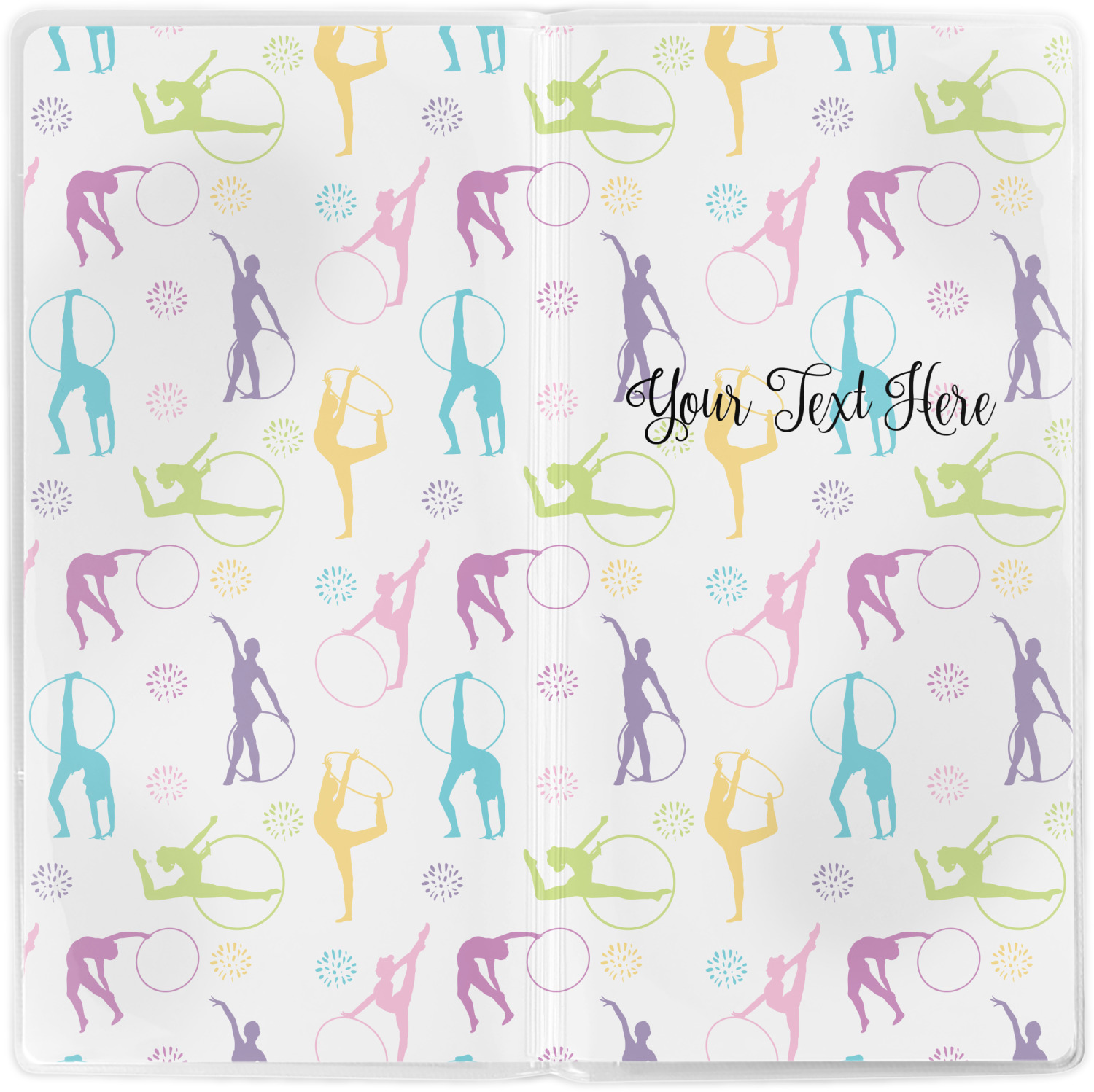 This design template is perfect for gymnasts, their friends and family. The main design features a pattern with gymnasts in pastel colors, some flowers and a white background. The optional personalization is name / text.