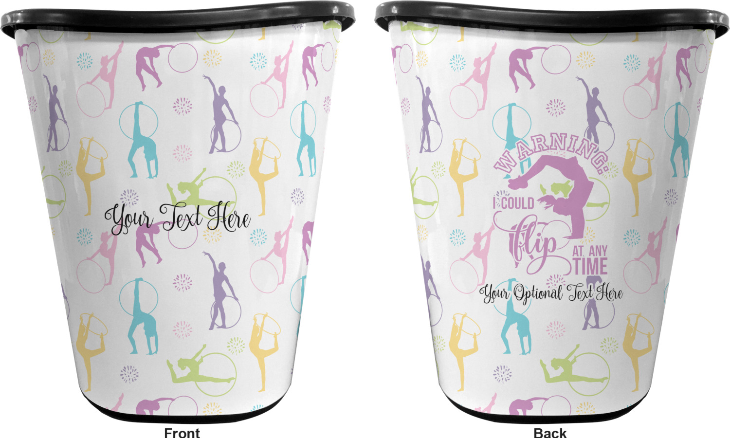 You can choose to purchase these decorative wastebaskets in either a white or a black color that will show on the base and the upper rim. Your customization is printed on a high-gloss, fine-quality vinyl adhesive, and you can choose to either have this adhesive applied to one side only or to both sides. As such, this plastic wastebasket can be single-sided or double-sided, depending on your creative vision. Your customization is printed using durable inks, making the design waterproof and resistant to fading over time.