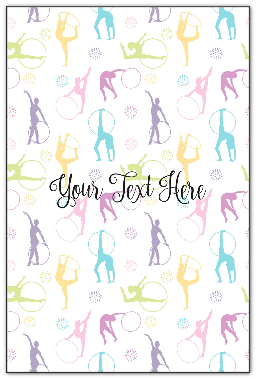 This design template is perfect for gymnasts, their friends and family. The main design features a pattern with gymnasts in pastel colors, some flowers and a white background. The optional personalization is name / text.