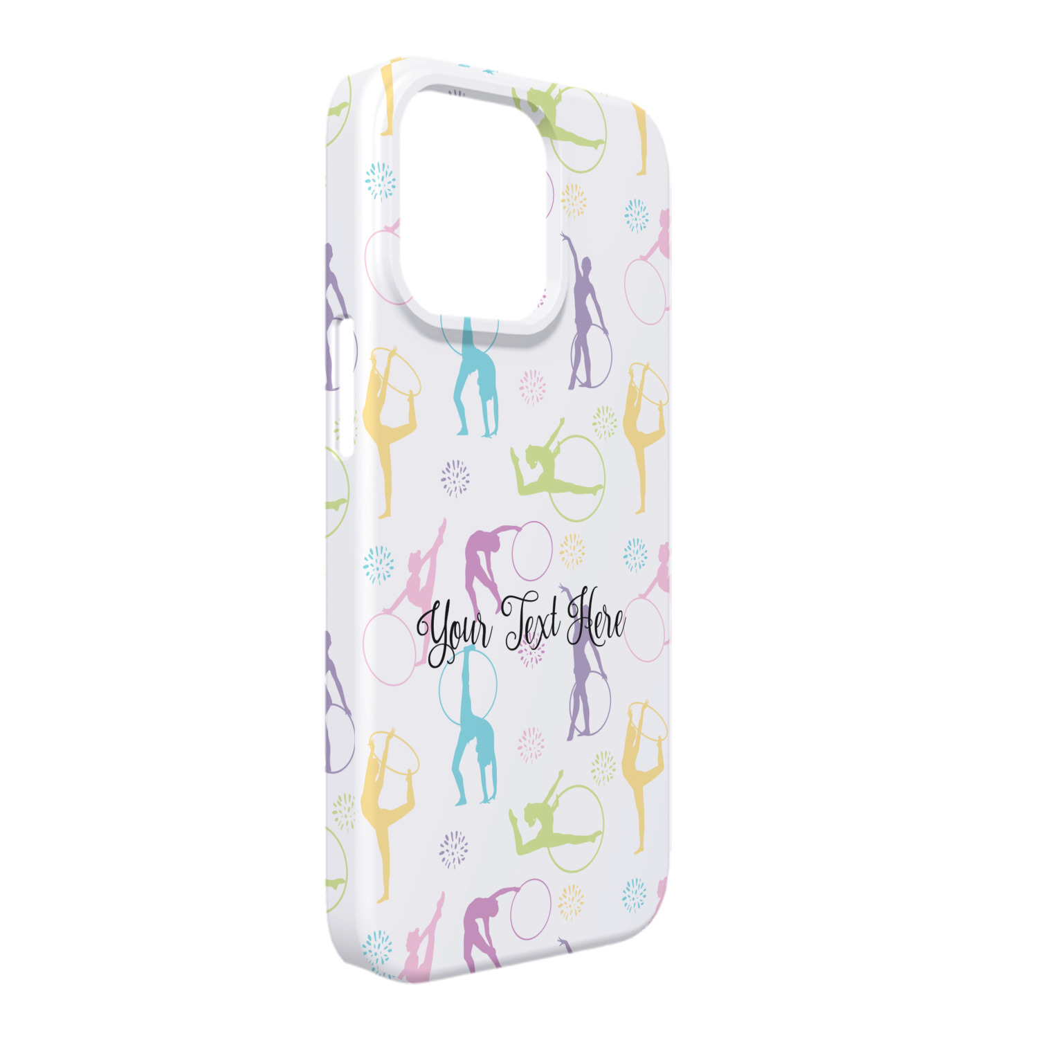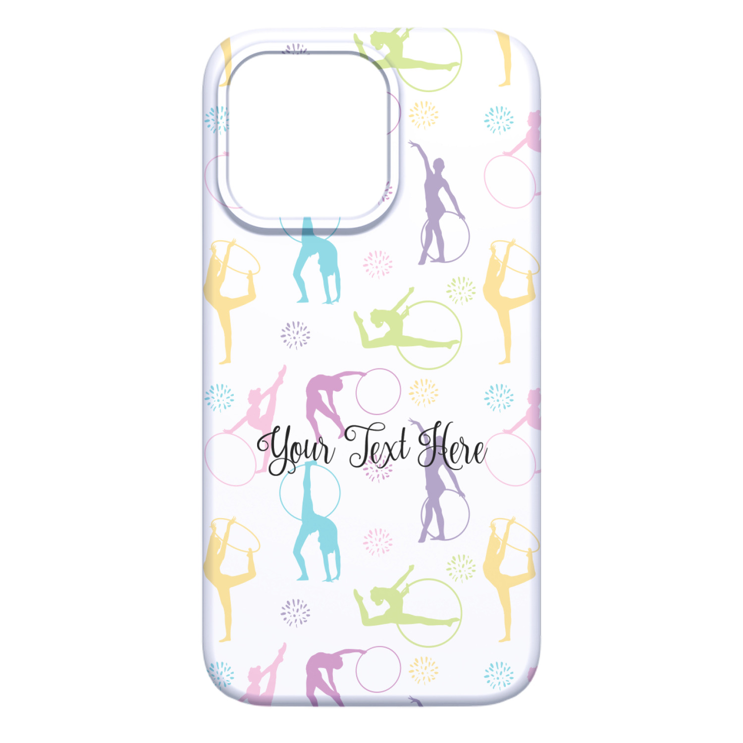 This design template is perfect for gymnasts, their friends and family. The main design features a pattern with gymnasts in pastel colors, some flowers and a white background. The optional personalization is name / text.