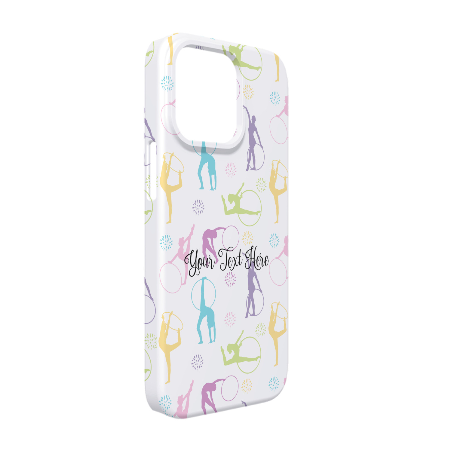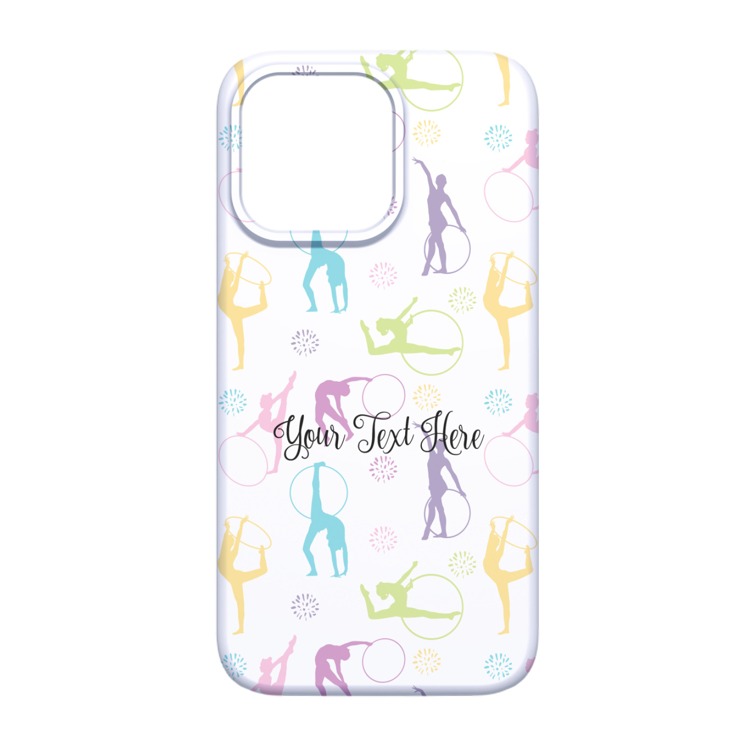 This design template is perfect for gymnasts, their friends and family. The main design features a pattern with gymnasts in pastel colors, some flowers and a white background. The optional personalization is name / text.