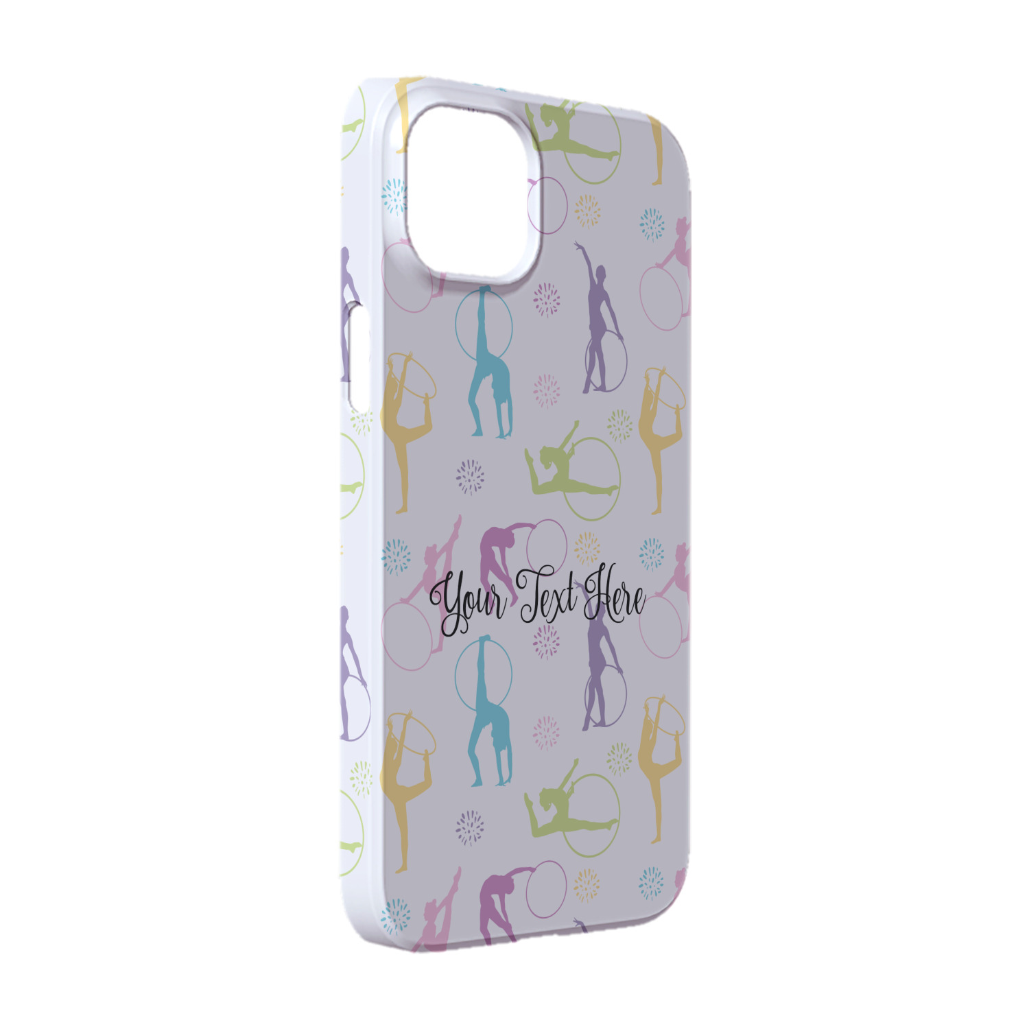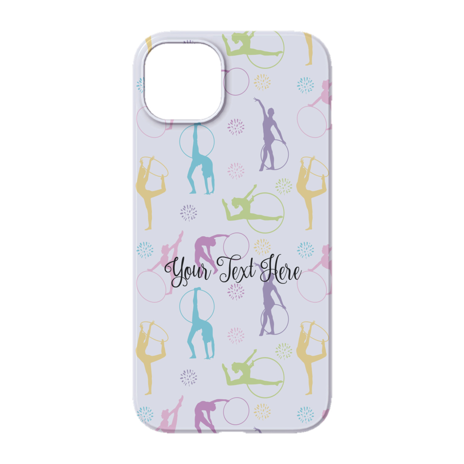 This design template is perfect for gymnasts, their friends and family. The main design features a pattern with gymnasts in pastel colors, some flowers and a white background. The optional personalization is name / text.