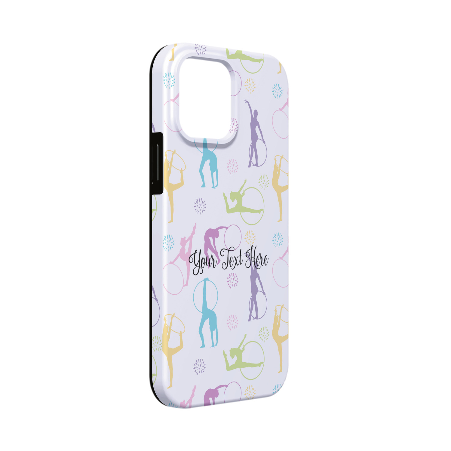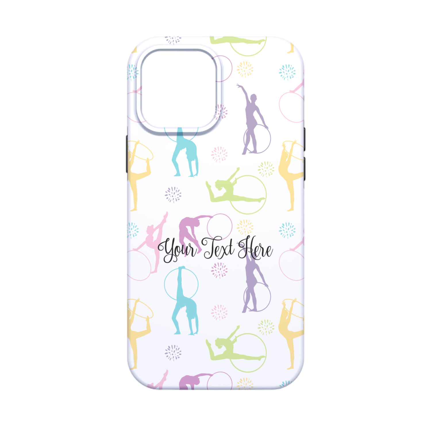 This design template is perfect for gymnasts, their friends and family. The main design features a pattern with gymnasts in pastel colors, some flowers and a white background. The optional personalization is name / text.