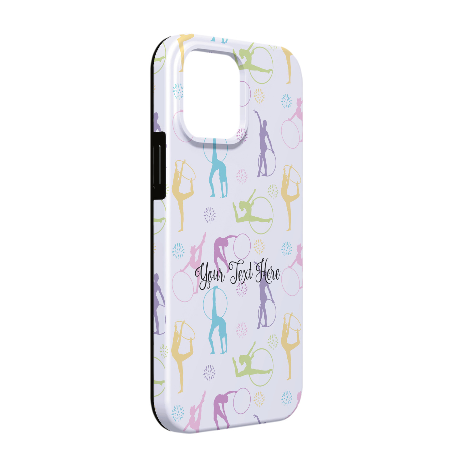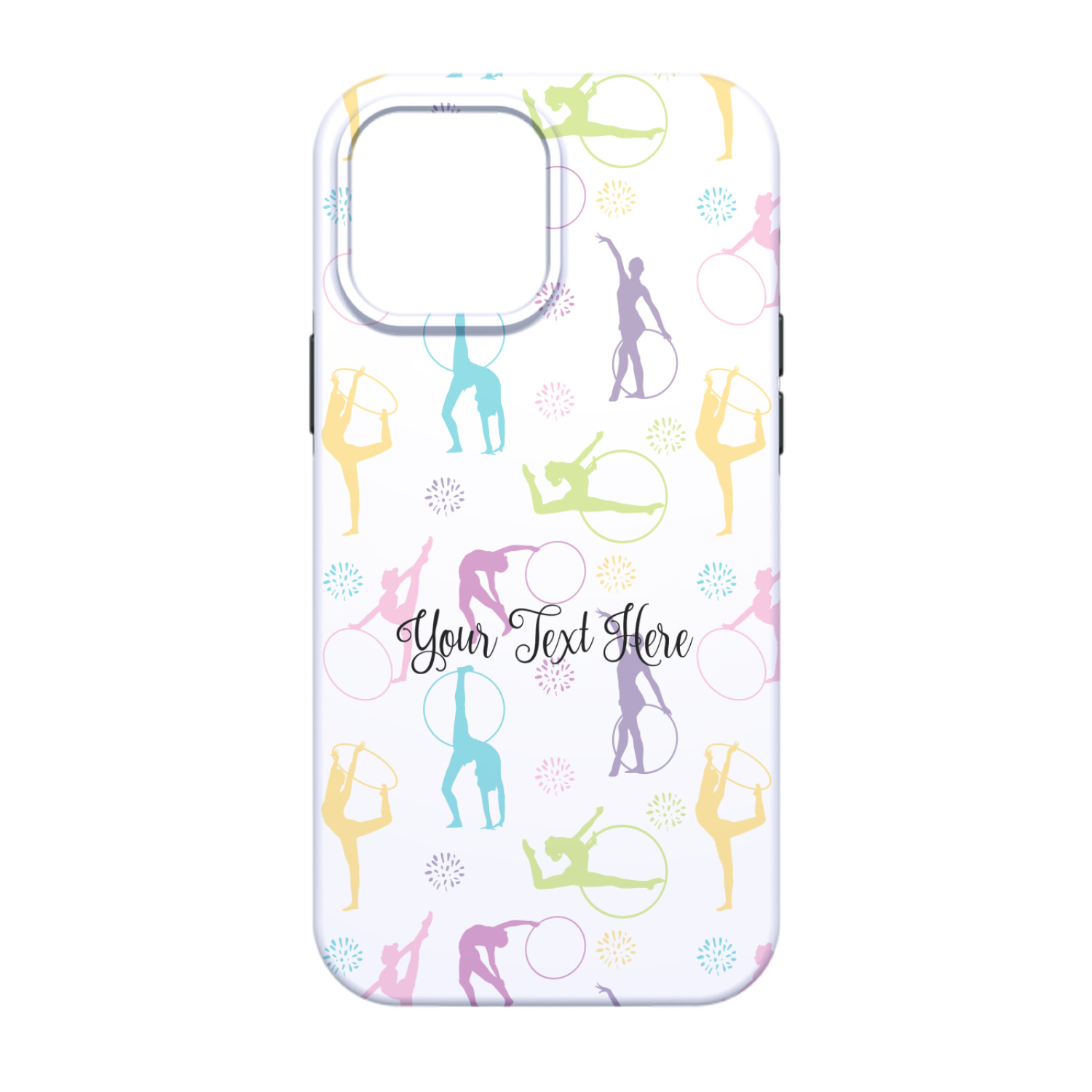 This design template is perfect for gymnasts, their friends and family. The main design features a pattern with gymnasts in pastel colors, some flowers and a white background. The optional personalization is name / text.