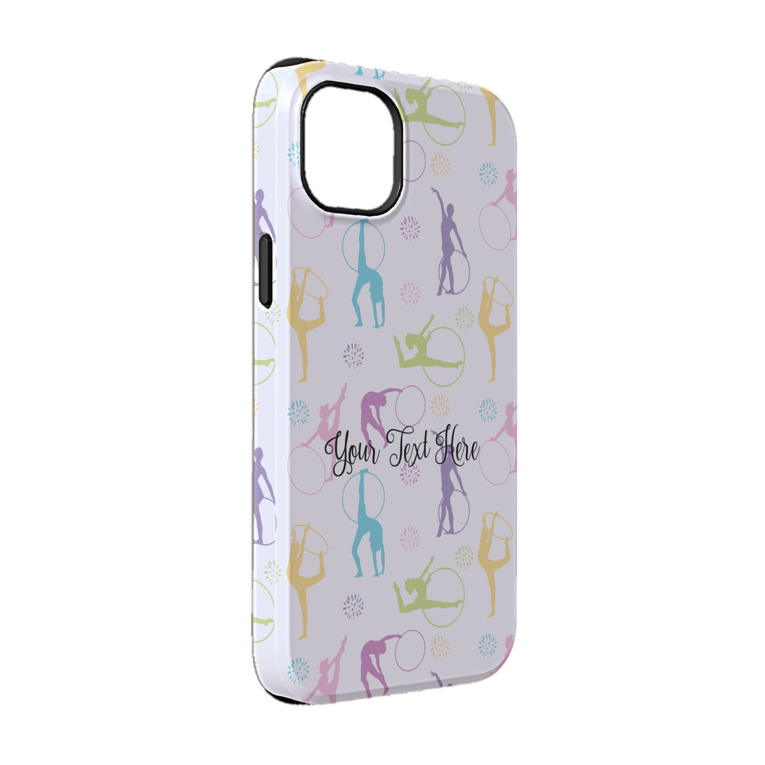 This design template is perfect for gymnasts, their friends and family. The main design features a pattern with gymnasts in pastel colors, some flowers and a white background. The optional personalization is name / text.