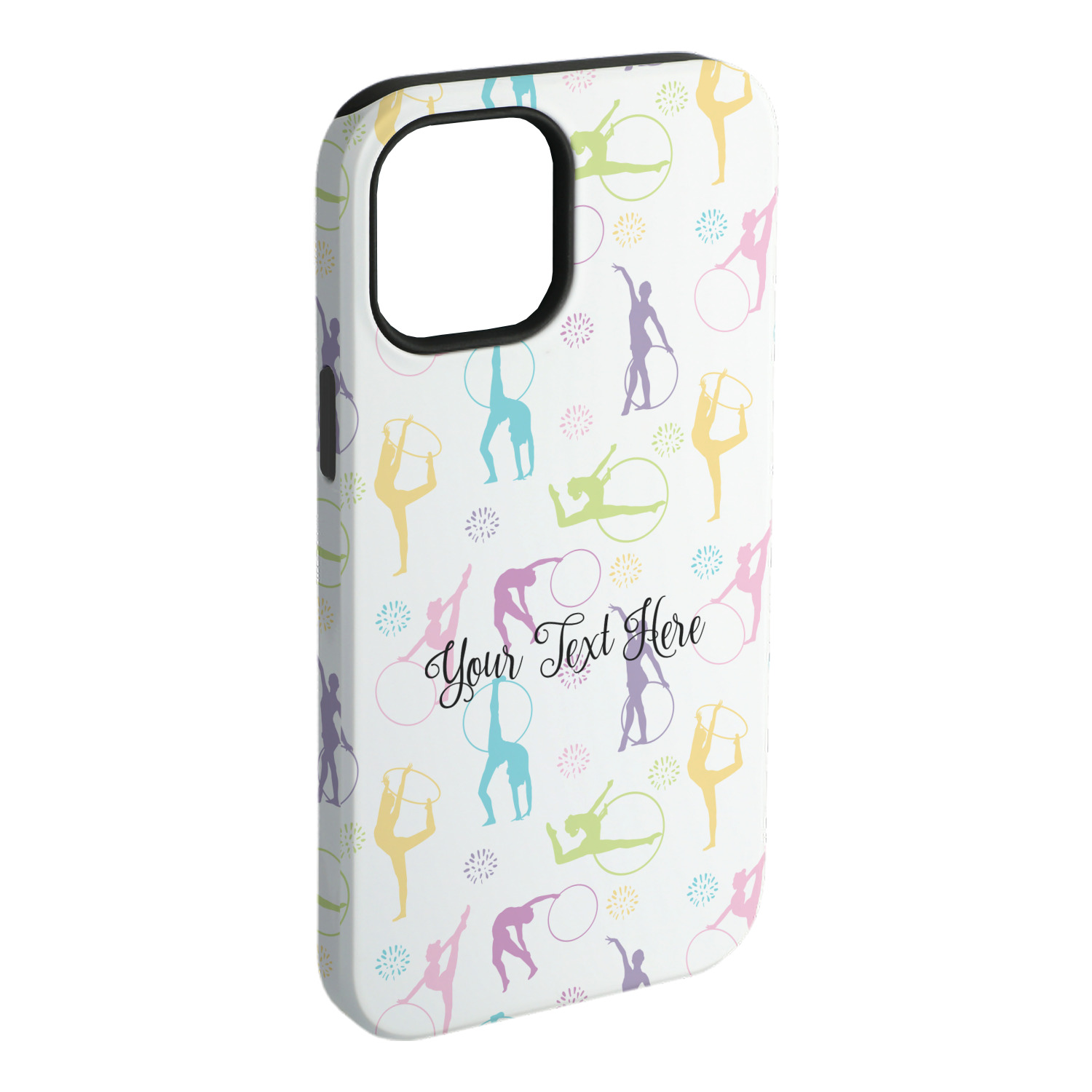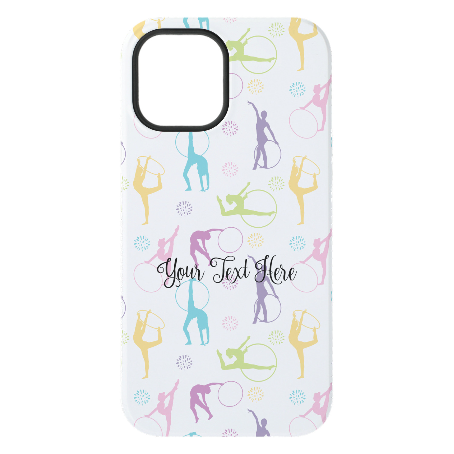 This design template is perfect for gymnasts, their friends and family. The main design features a pattern with gymnasts in pastel colors, some flowers and a white background. The optional personalization is name / text.