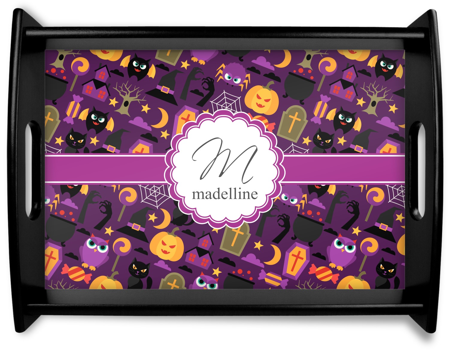 This serving tray with handles features square edges and two rounded sides, creating a very modern look. Each side is fabricated from a beautifully cut, natural wood. The bottom of the interior of the tray displays your customized design in bright, vibrant color. The tray is sold in both a black color and a natural wood look. Each variation of the wood serving tray has two sizes: Small, which is 14" x 10" x 2.25", and Large, which is 19.5" x 13.5" x 2.75".
