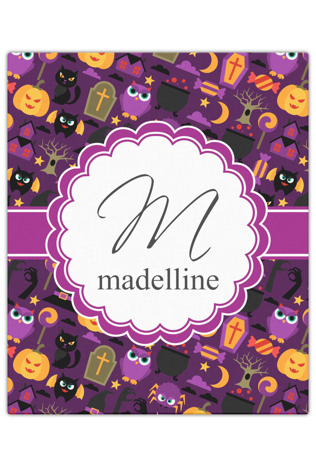 Halloween: a night filled with witch's hats, cauldrons overflowing with bubbly substances, jack-o'-lanterns, and of course, CANDY. This design brings together all your favorite things from October 31st on a deep violet background, the most mysterious color of all.