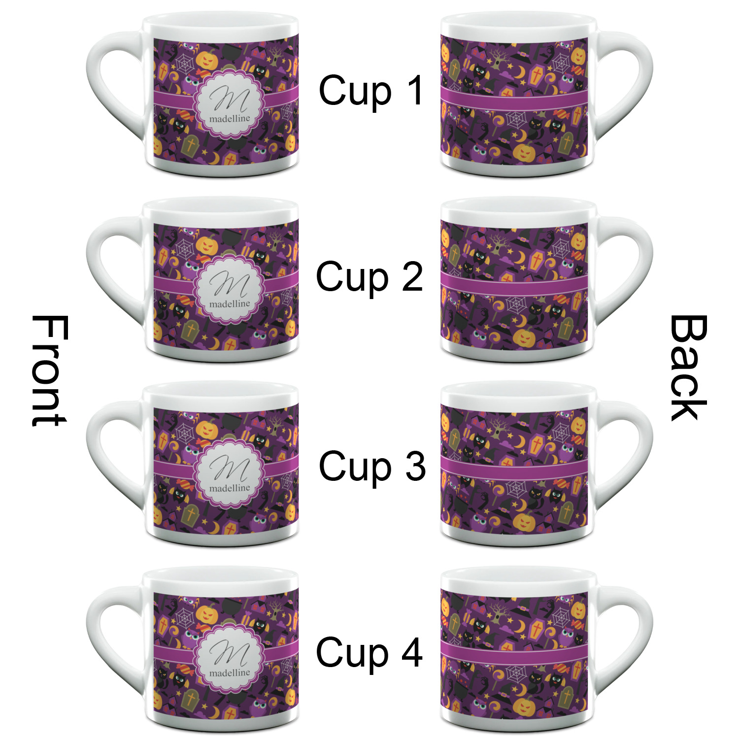 Each of our espresso mugs is a ceramic material sure to keep your drink warm. Personalize one cup for yourself, or order a set of 4! Its the perfect little gift for any coffee lover! We carry two sizes for you to personalize - 3 oz. (approx. 3.25" x 2.325" x 2.625") or 6 oz. (approx. 4" x 2.9" x 2.9"). Our 3 oz. mug is perfect for that single shot espresso while our 6 oz. mug can be your next favorite cappuccino cup holding two shots of espresso!