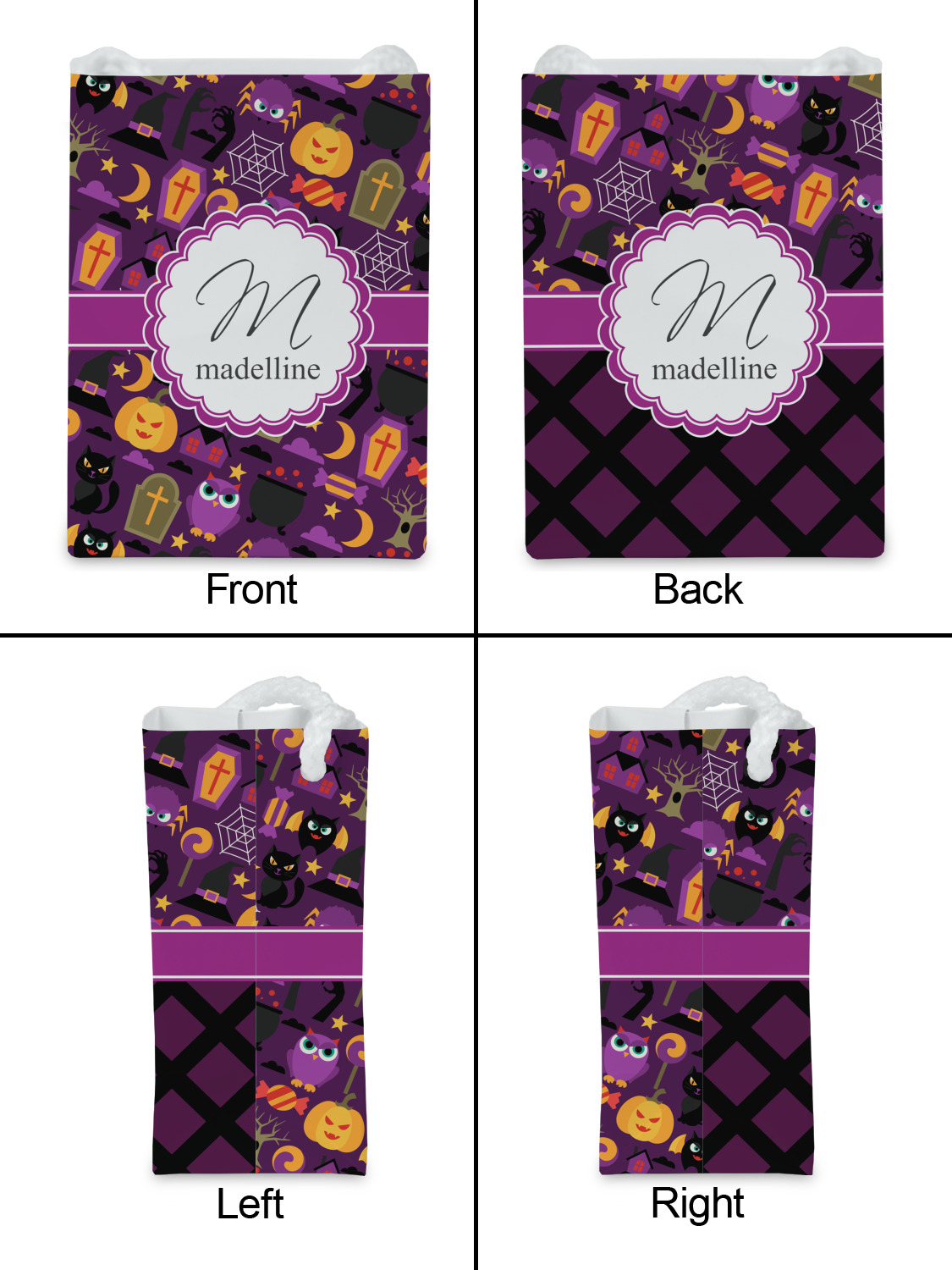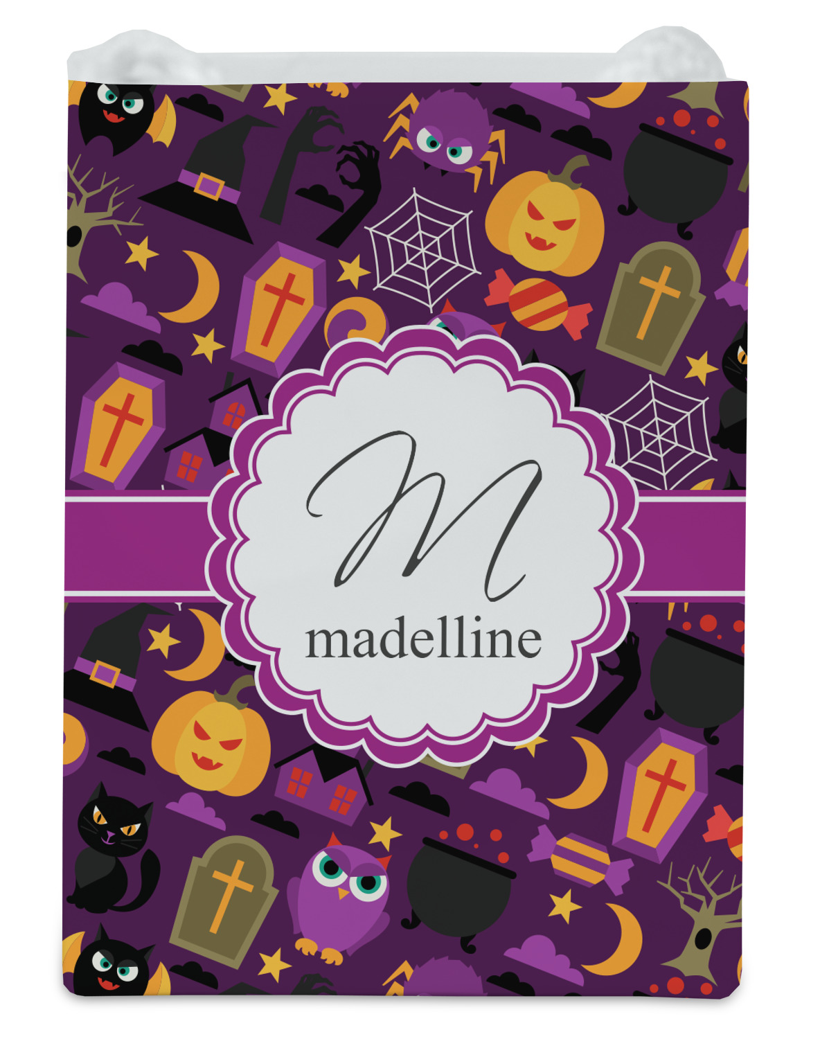 Halloween: a night filled with witch's hats, cauldrons overflowing with bubbly substances, jack-o'-lanterns, and of course, CANDY. This design brings together all your favorite things from October 31st on a deep violet background, the most mysterious color of all.