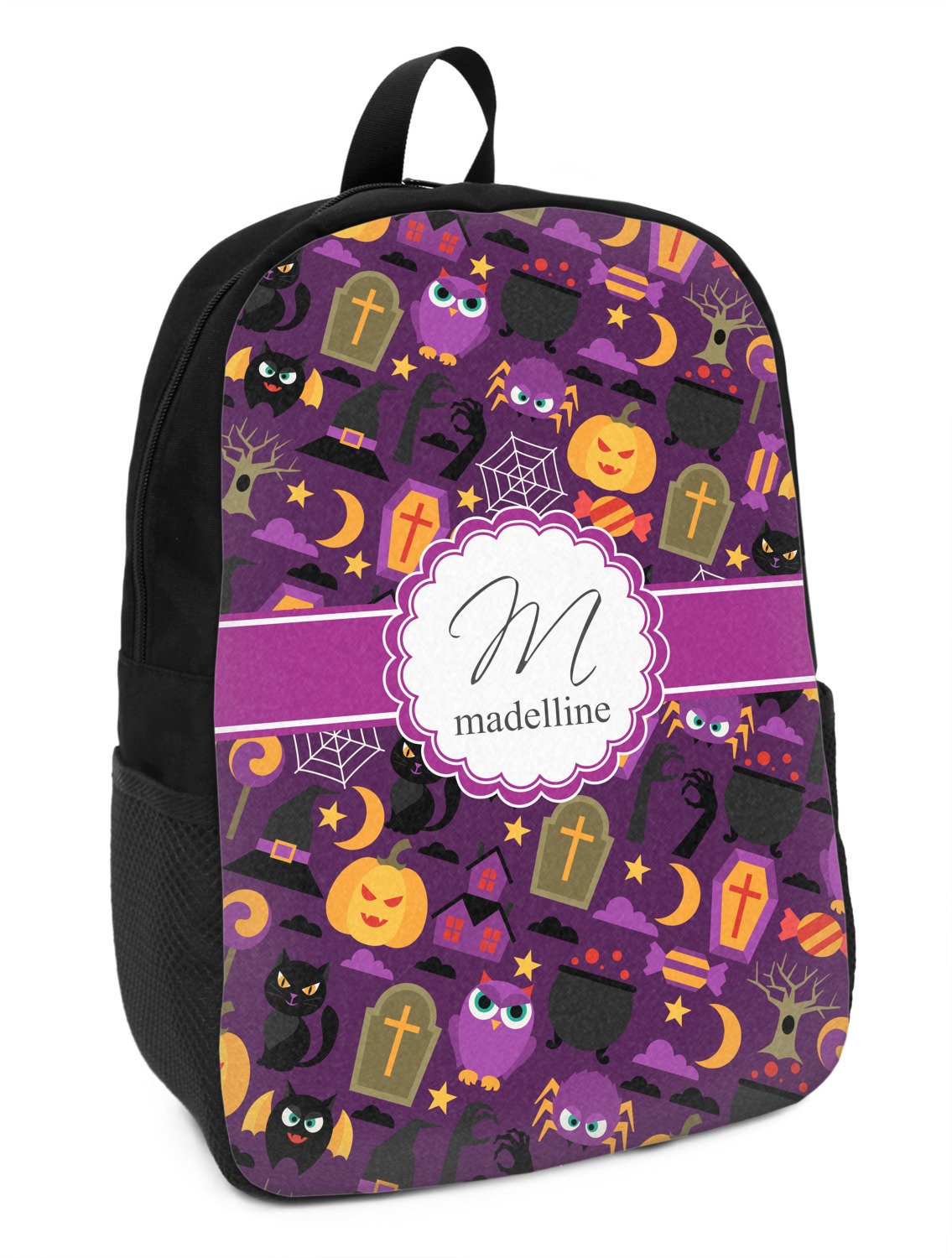 These small backpacks are made of a durable black canvas material with your personalization right on the front. The two shoulder straps are padded and easily adjustable. The bag itself measures at about 11" W x 15" H x 5" D. It's the perfect size for elementary aged kids or adults who want a smaller backpack. On the top of the bag you will find a handle to hang or carry your backpack by as well as a large zipper closure to keep all of your belongings safe inside. On each side of your backpack is a mesh pocket for a small item or water bottle. Inside your backpack you will find a spacious area with a small zipper pocket and a padded laptop slot that will fit up to a 13" laptop (13" being very snug). This is the perfect bag for any student that needs a couple books and their laptop with them at all times. It also works great as a carry on for traveling!