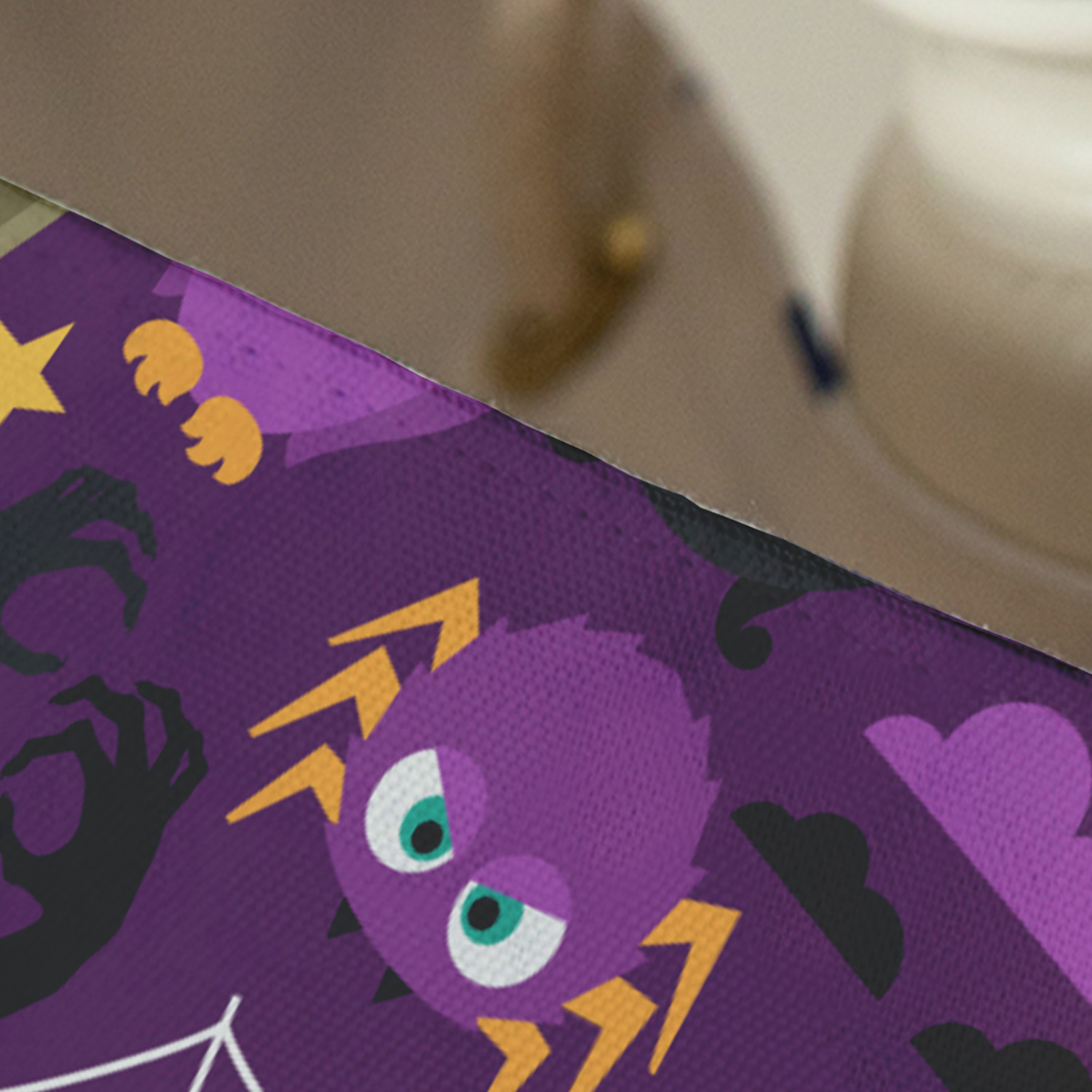 Halloween: a night filled with witch's hats, cauldrons overflowing with bubbly substances, jack-o'-lanterns, and of course, CANDY. This design brings together all your favorite things from October 31st on a deep violet background, the most mysterious color of all.