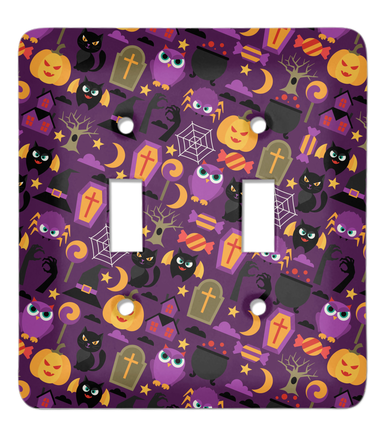 Halloween: a night filled with witch's hats, cauldrons overflowing with bubbly substances, jack-o'-lanterns, and of course, CANDY. This design brings together all your favorite things from October 31st on a deep violet background, the most mysterious color of all.