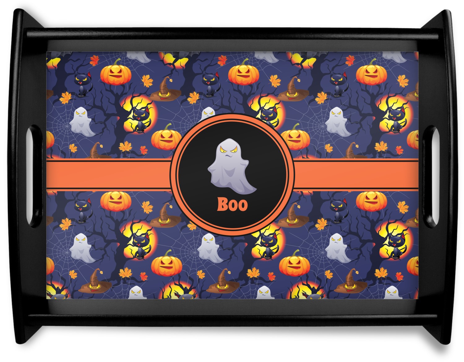 This serving tray with handles features square edges and two rounded sides, creating a very modern look. Each side is fabricated from a beautifully cut, natural wood. The bottom of the interior of the tray displays your customized design in bright, vibrant color. The tray is sold in both a black color and a natural wood look. Each variation of the wood serving tray has two sizes: Small, which is 14" x 10" x 2.25", and Large, which is 19.5" x 13.5" x 2.75".