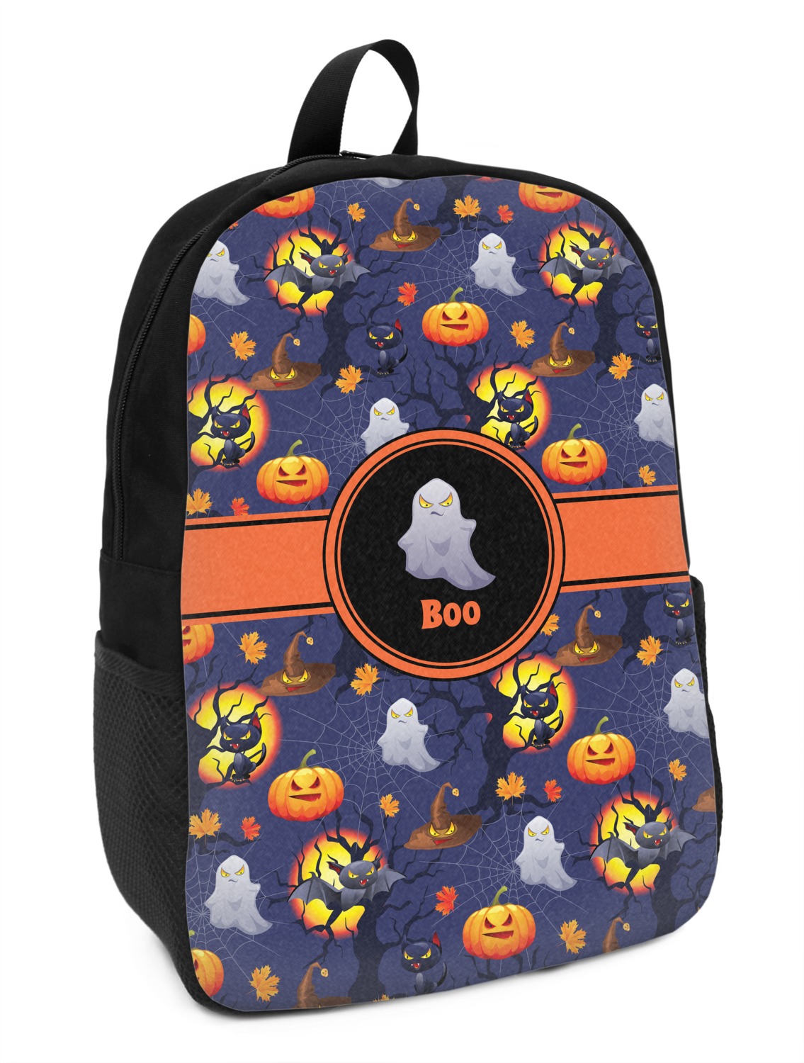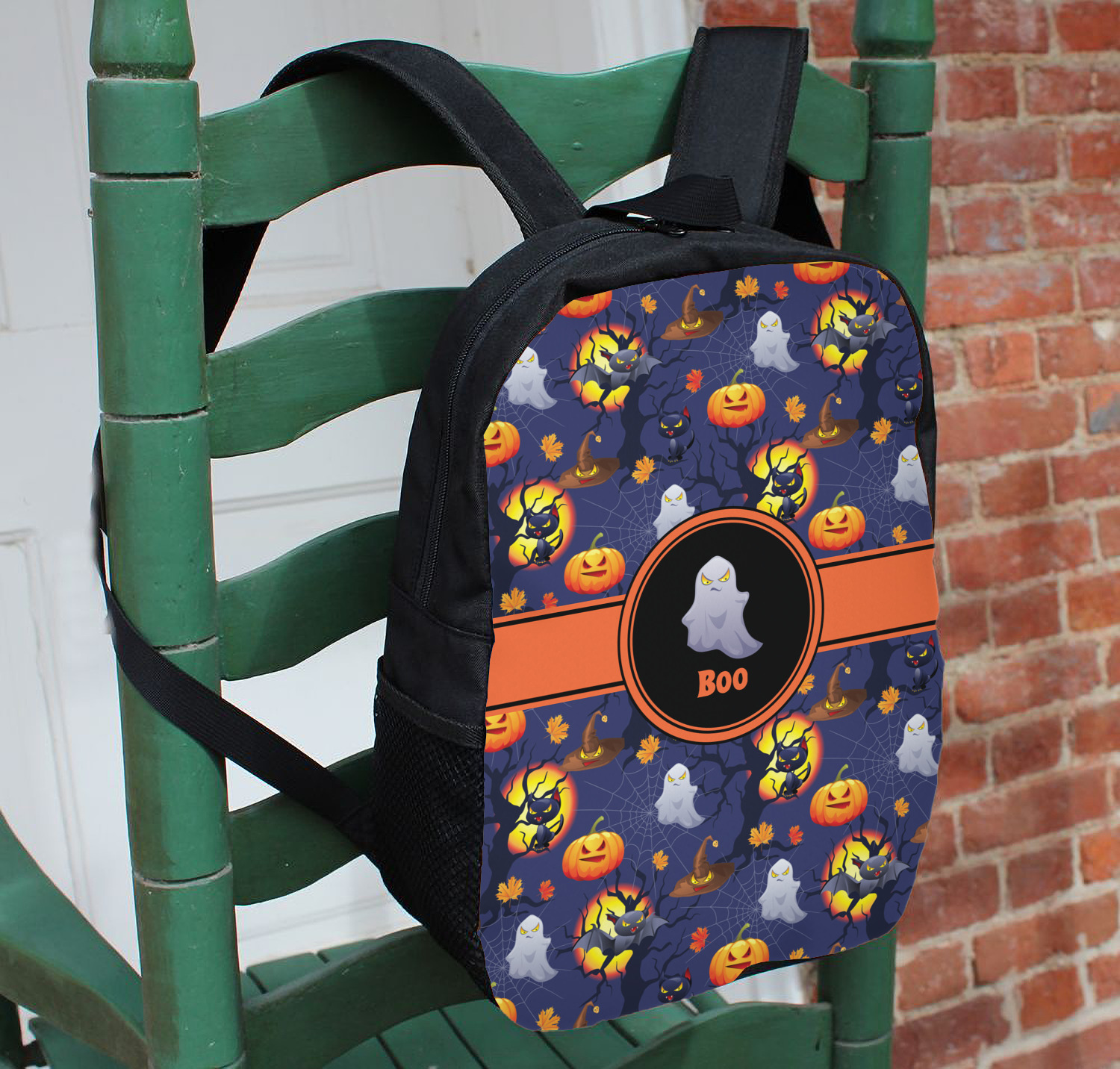 These small backpacks are made of a durable black canvas material with your personalization right on the front. The two shoulder straps are padded and easily adjustable. The bag itself measures at about 11" W x 15" H x 5" D. It's the perfect size for elementary aged kids or adults who want a smaller backpack. On the top of the bag you will find a handle to hang or carry your backpack by as well as a large zipper closure to keep all of your belongings safe inside. On each side of your backpack is a mesh pocket for a small item or water bottle. Inside your backpack you will find a spacious area with a small zipper pocket and a padded laptop slot that will fit up to a 13" laptop (13" being very snug). This is the perfect bag for any student that needs a couple books and their laptop with them at all times. It also works great as a carry on for traveling!