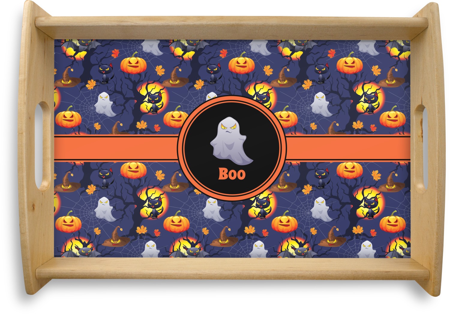 This serving tray with handles features square edges and two rounded sides, creating a very modern look. Each side is fabricated from a beautifully cut, natural wood. The bottom of the interior of the tray displays your customized design in bright, vibrant color. The tray is sold in both a black color and a natural wood look. Each variation of the wood serving tray has two sizes: Small, which is 14" x 10" x 2.25", and Large, which is 19.5" x 13.5" x 2.75".
