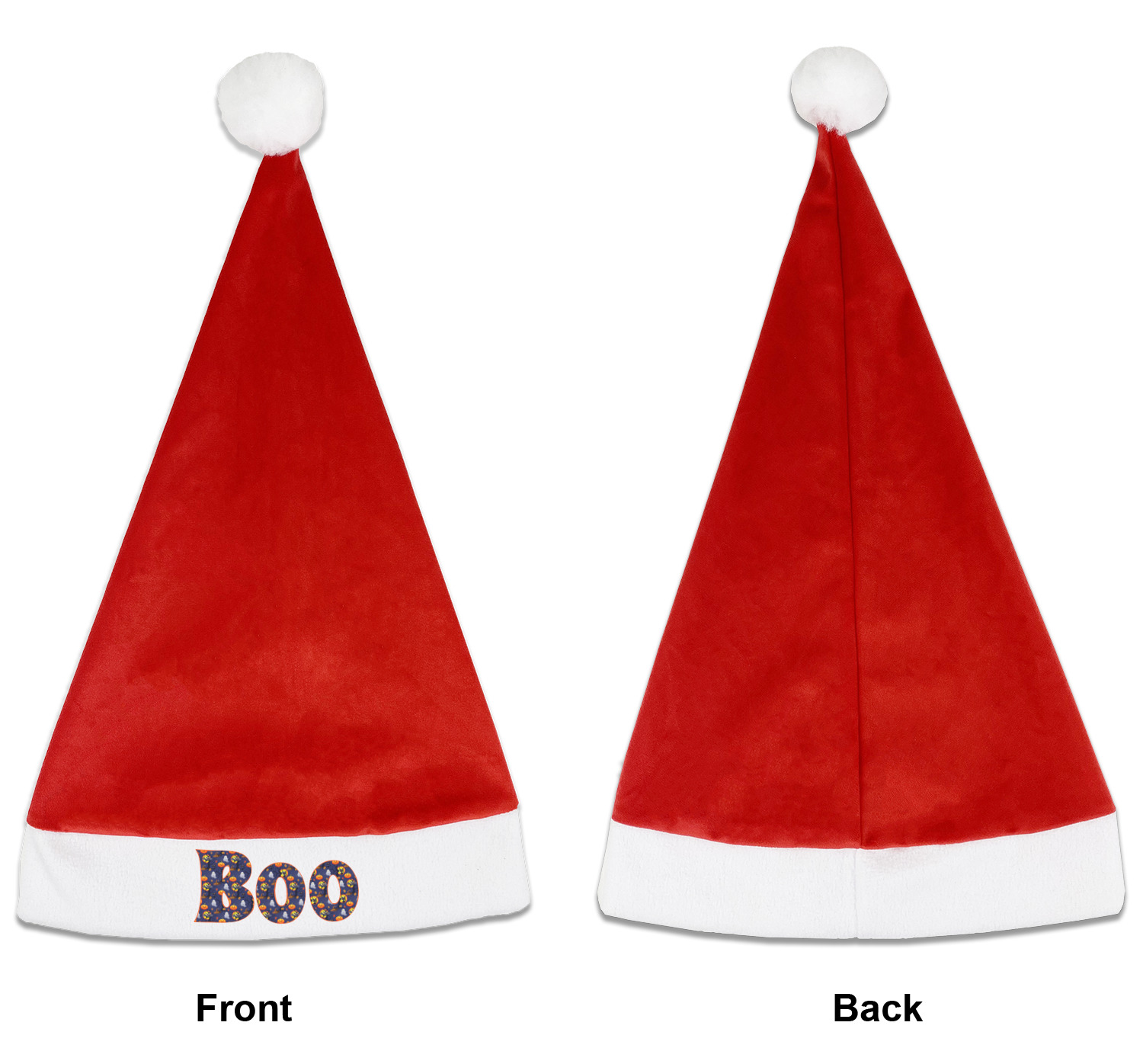 Our Santa hats are a soft, velvety polyester material. These customizable Santa hats are a classic red with white brimming and pom pom ball hanging off the hat tail just like Santa Claus! Each personalized Santa hat is approximately 17.5 L x 11.8 W. We offer two different styles to print your designs on the white brim - front or front & back.