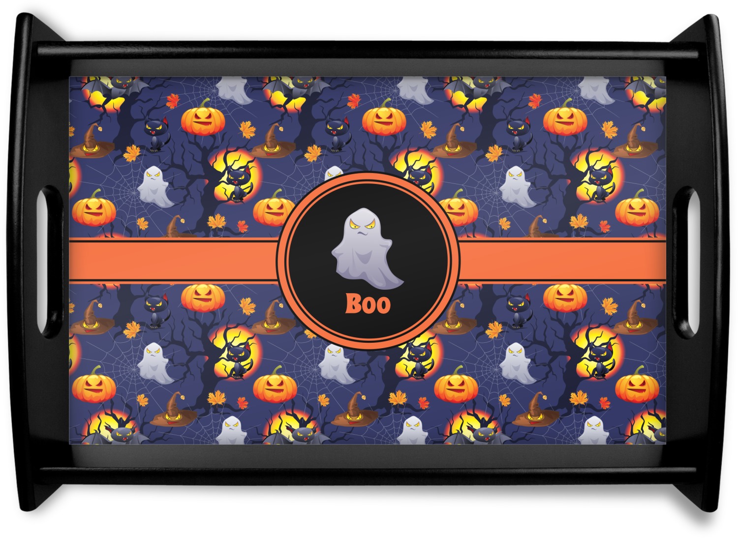 This serving tray with handles features square edges and two rounded sides, creating a very modern look. Each side is fabricated from a beautifully cut, natural wood. The bottom of the interior of the tray displays your customized design in bright, vibrant color. The tray is sold in both a black color and a natural wood look. Each variation of the wood serving tray has two sizes: Small, which is 14" x 10" x 2.25", and Large, which is 19.5" x 13.5" x 2.75".