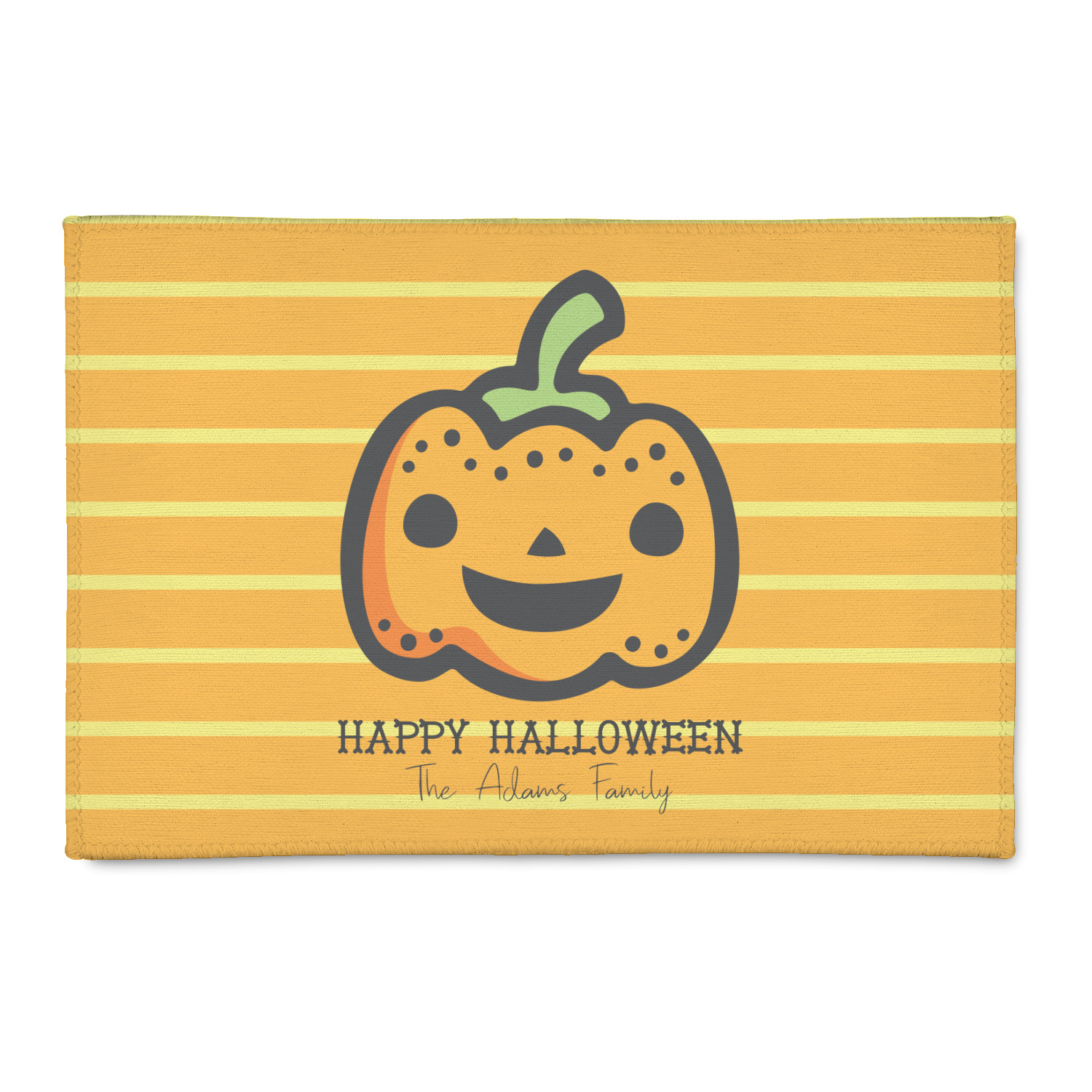 The design features a fun-loving pumpkin as the main focus. He even has a cute little smile on his face that will make you smile right back. The background is a subtle striped one with yellow and orange as the colors. Your personalization or greeting goes directly underneath your pumpkin friend. The coordinating design even has a cute little ghost who thinks that you are "bootiful" and "spooktacular."