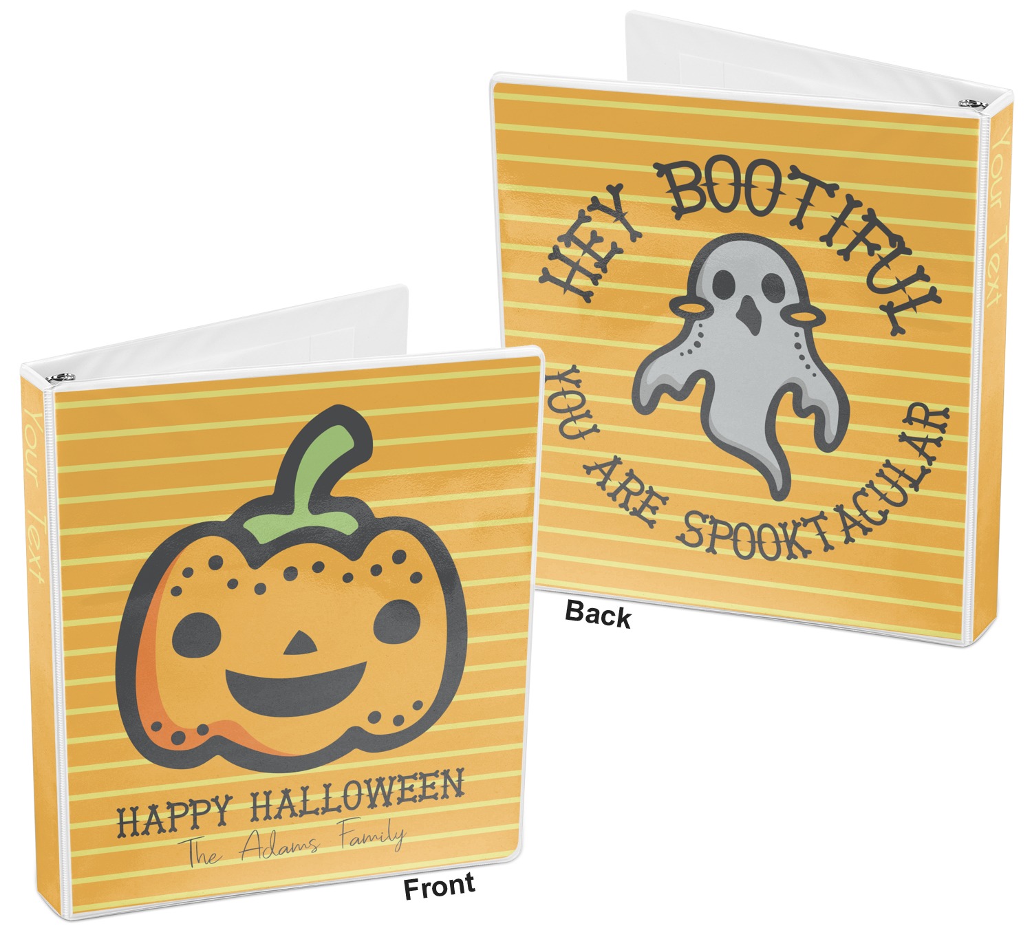 The design features a fun-loving pumpkin as the main focus. He even has a cute little smile on his face that will make you smile right back. The background is a subtle striped one with yellow and orange as the colors. Your personalization or greeting goes directly underneath your pumpkin friend. The coordinating design even has a cute little ghost who thinks that you are "bootiful" and "spooktacular."