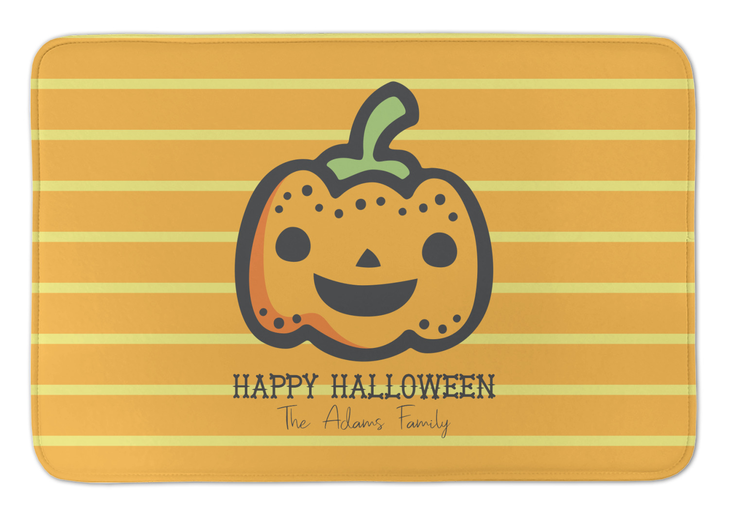 The design features a fun-loving pumpkin as the main focus. He even has a cute little smile on his face that will make you smile right back. The background is a subtle striped one with yellow and orange as the colors. Your personalization or greeting goes directly underneath your pumpkin friend. The coordinating design even has a cute little ghost who thinks that you are "bootiful" and "spooktacular."