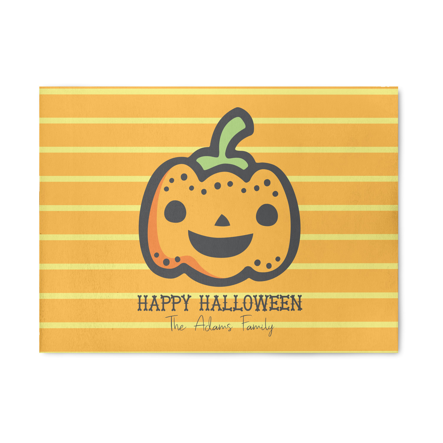 The design features a fun-loving pumpkin as the main focus. He even has a cute little smile on his face that will make you smile right back. The background is a subtle striped one with yellow and orange as the colors. Your personalization or greeting goes directly underneath your pumpkin friend. The coordinating design even has a cute little ghost who thinks that you are "bootiful" and "spooktacular."