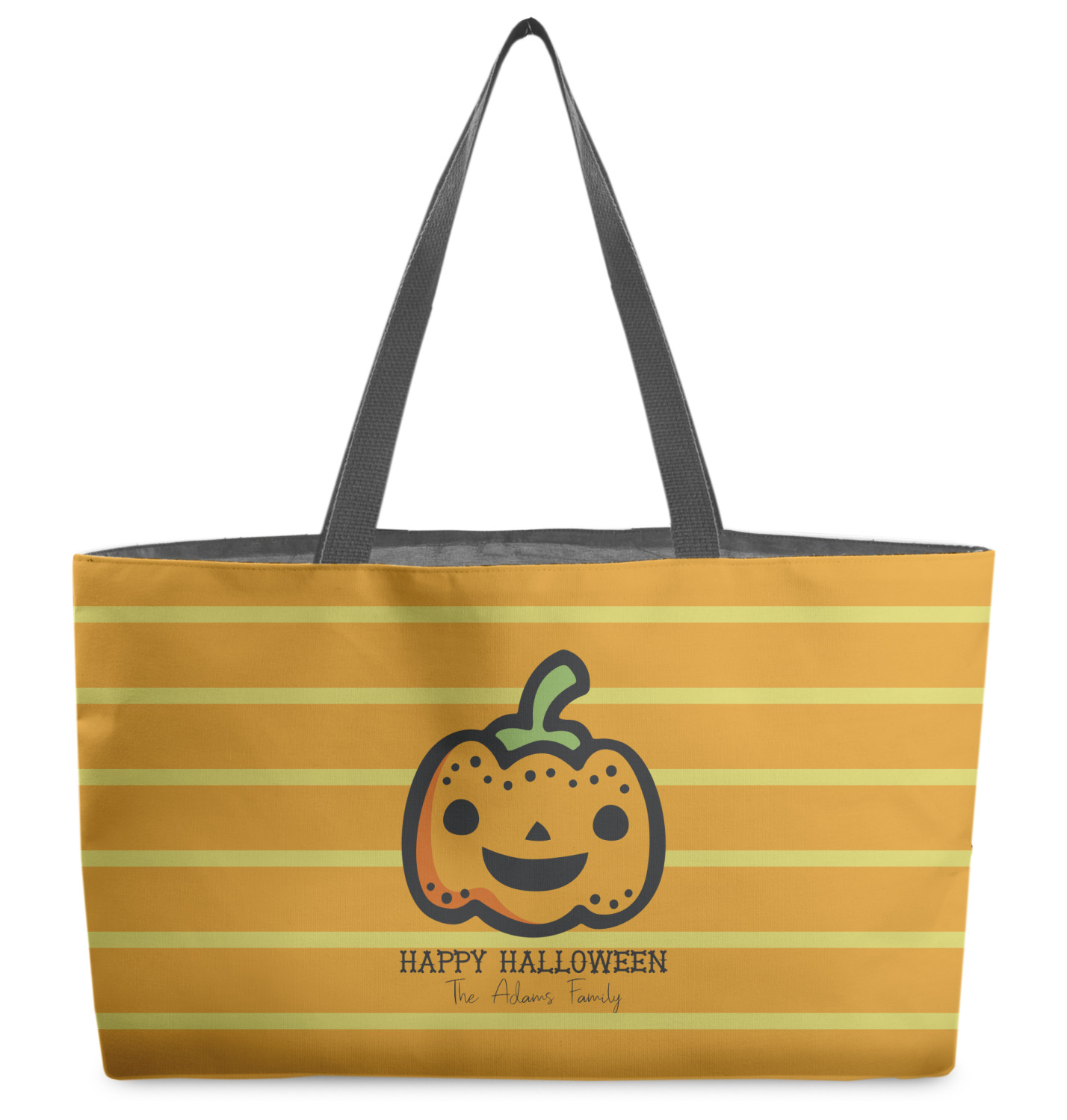 The design features a fun-loving pumpkin as the main focus. He even has a cute little smile on his face that will make you smile right back. The background is a subtle striped one with yellow and orange as the colors. Your personalization or greeting goes directly underneath your pumpkin friend. The coordinating design even has a cute little ghost who thinks that you are "bootiful" and "spooktacular."