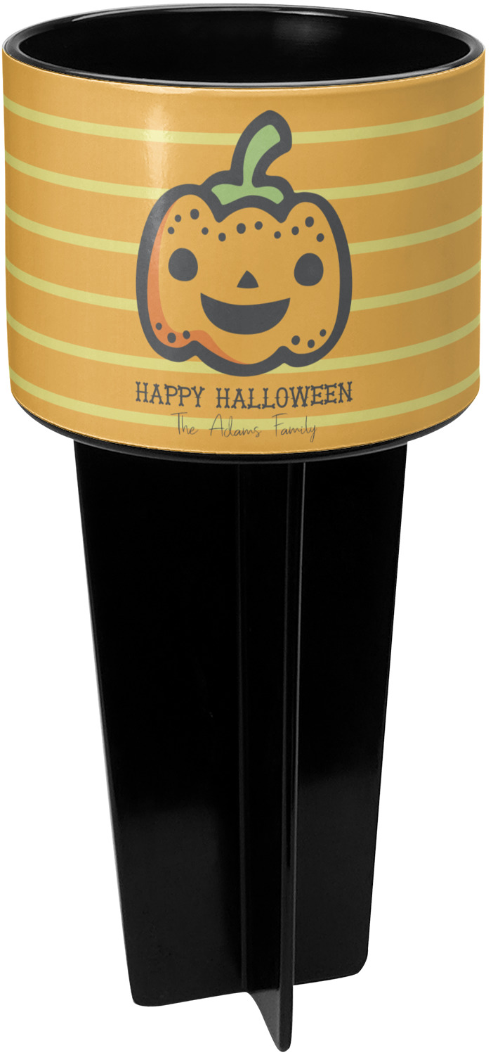 This cup holder has a large stake at its bottom that anchors it to the sand or ground below, while the cup holder rests above the stake. The entire drink holder is made of durable plastic and displays your customization around the cup holder portion. We sell these personalized beach spikers in two different colors: black and white.
