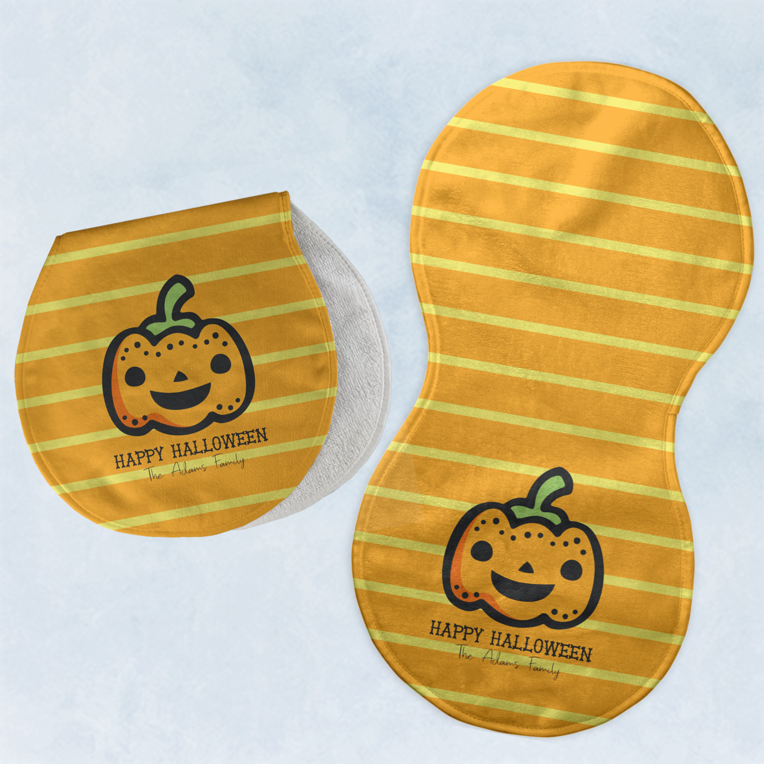 The design features a fun-loving pumpkin as the main focus. He even has a cute little smile on his face that will make you smile right back. The background is a subtle striped one with yellow and orange as the colors. Your personalization or greeting goes directly underneath your pumpkin friend. The coordinating design even has a cute little ghost who thinks that you are "bootiful" and "spooktacular."