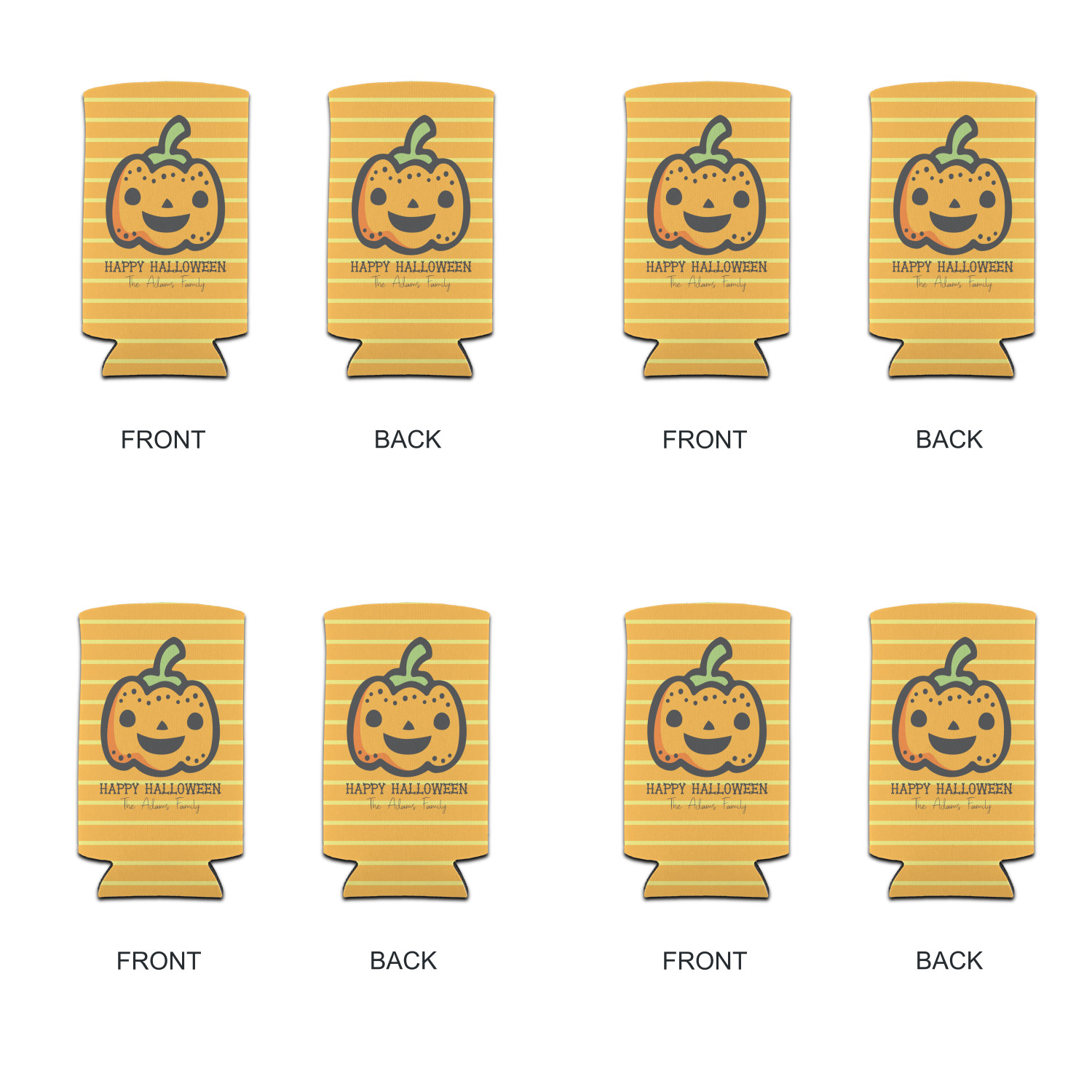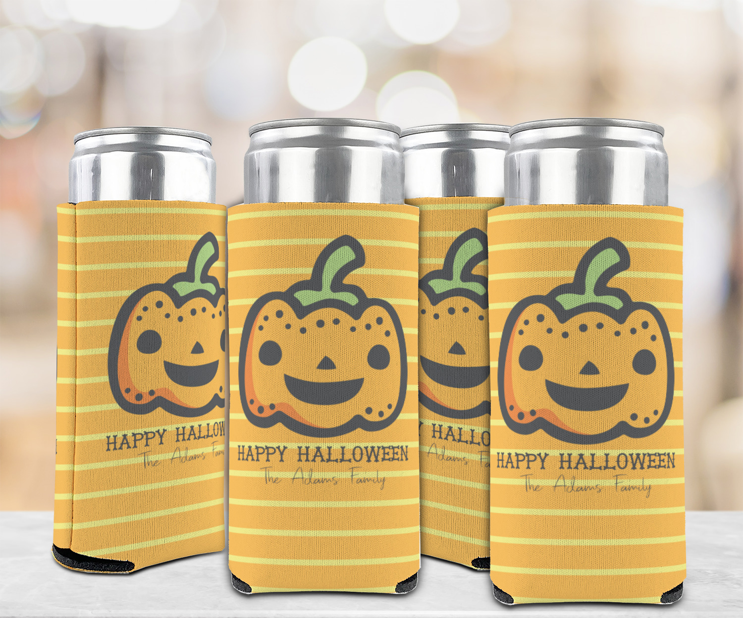 The design features a fun-loving pumpkin as the main focus. He even has a cute little smile on his face that will make you smile right back. The background is a subtle striped one with yellow and orange as the colors. Your personalization or greeting goes directly underneath your pumpkin friend. The coordinating design even has a cute little ghost who thinks that you are "bootiful" and "spooktacular."