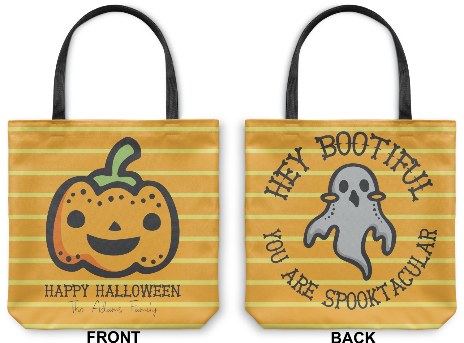 The design features a fun-loving pumpkin as the main focus. He even has a cute little smile on his face that will make you smile right back. The background is a subtle striped one with yellow and orange as the colors. Your personalization or greeting goes directly underneath your pumpkin friend. The coordinating design even has a cute little ghost who thinks that you are "bootiful" and "spooktacular."