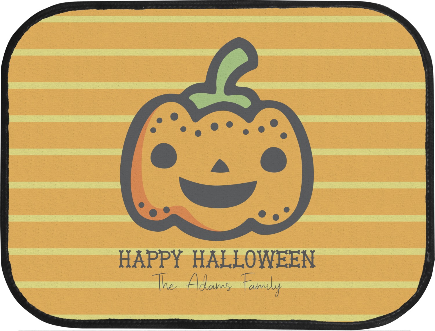 The design features a fun-loving pumpkin as the main focus. He even has a cute little smile on his face that will make you smile right back. The background is a subtle striped one with yellow and orange as the colors. Your personalization or greeting goes directly underneath your pumpkin friend. The coordinating design even has a cute little ghost who thinks that you are "bootiful" and "spooktacular."