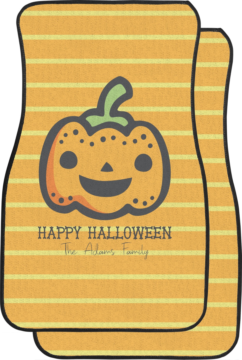 The design features a fun-loving pumpkin as the main focus. He even has a cute little smile on his face that will make you smile right back. The background is a subtle striped one with yellow and orange as the colors. Your personalization or greeting goes directly underneath your pumpkin friend. The coordinating design even has a cute little ghost who thinks that you are "bootiful" and "spooktacular."