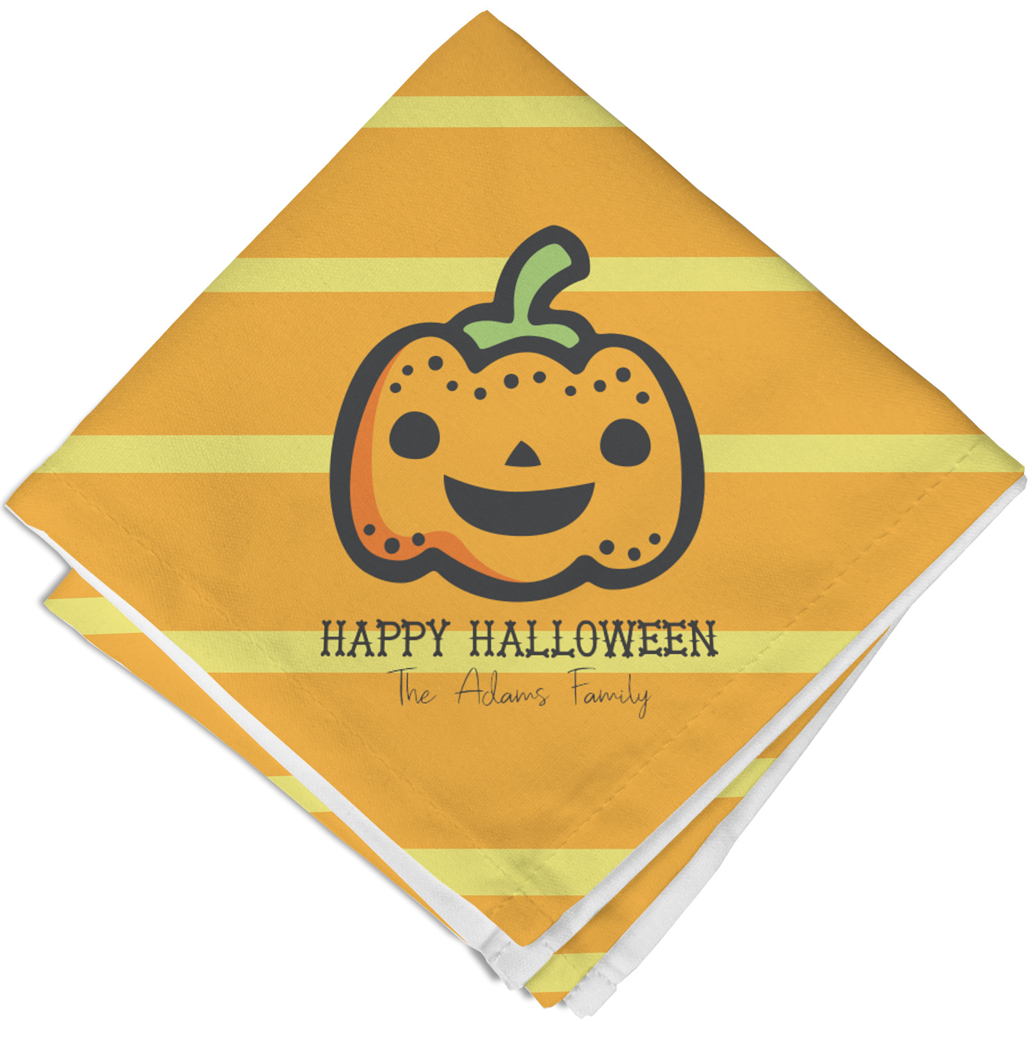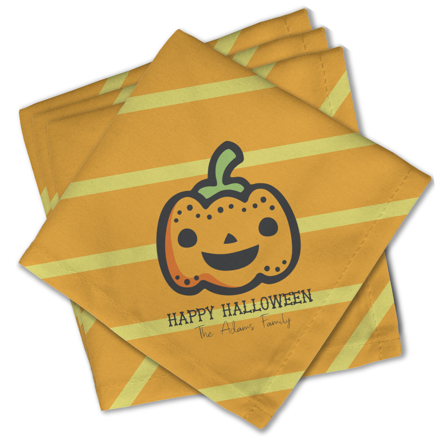 The design features a fun-loving pumpkin as the main focus. He even has a cute little smile on his face that will make you smile right back. The background is a subtle striped one with yellow and orange as the colors. Your personalization or greeting goes directly underneath your pumpkin friend. The coordinating design even has a cute little ghost who thinks that you are "bootiful" and "spooktacular."