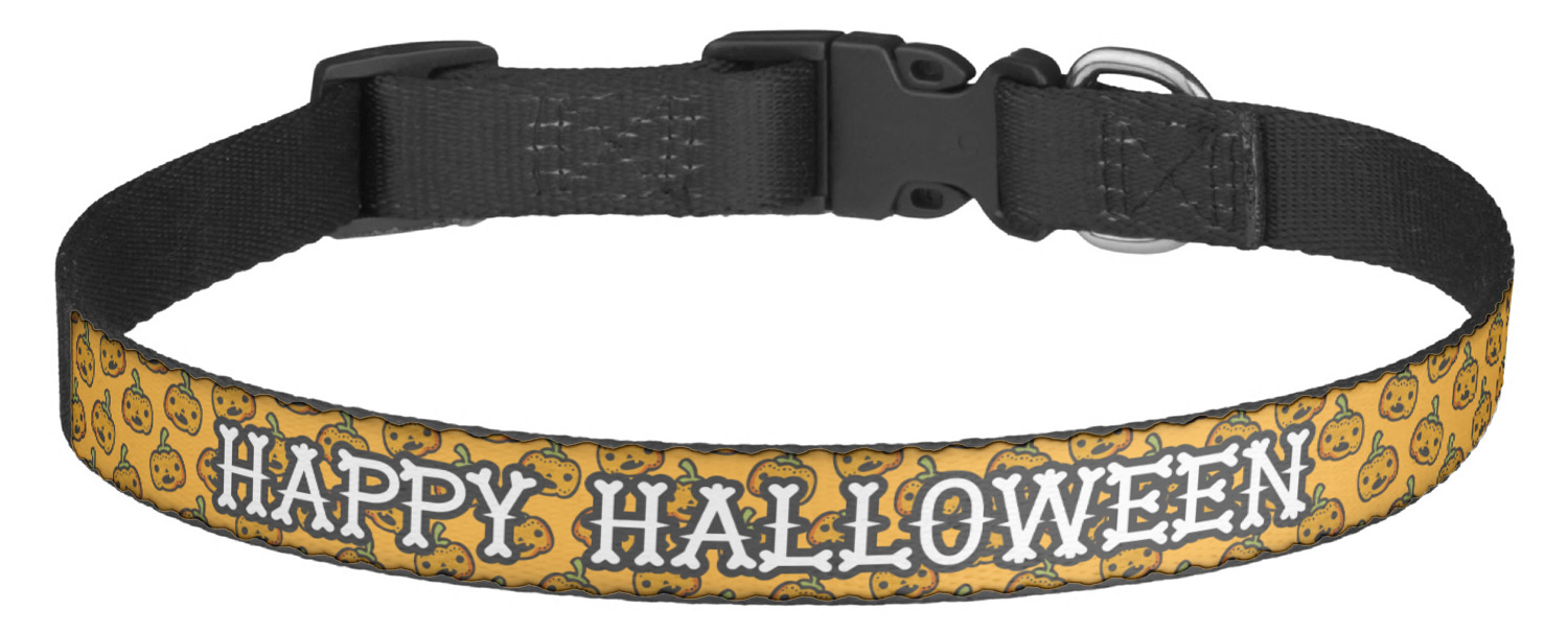 This sturdy collar, made from a durable nylon weave, will outlive your dog's episodes of excited tugging and pulling. Courtesy of its thick plastic buckle and adjuster, this collar is adjustable and accommodating of any dog. Structurally, the collar is a single piece of nylon weave that is sewn together, and features a solid metal loop where you can attach a leash or dog tag. We print and display your dog's name and pattern across the middle of the personalized dog collar.