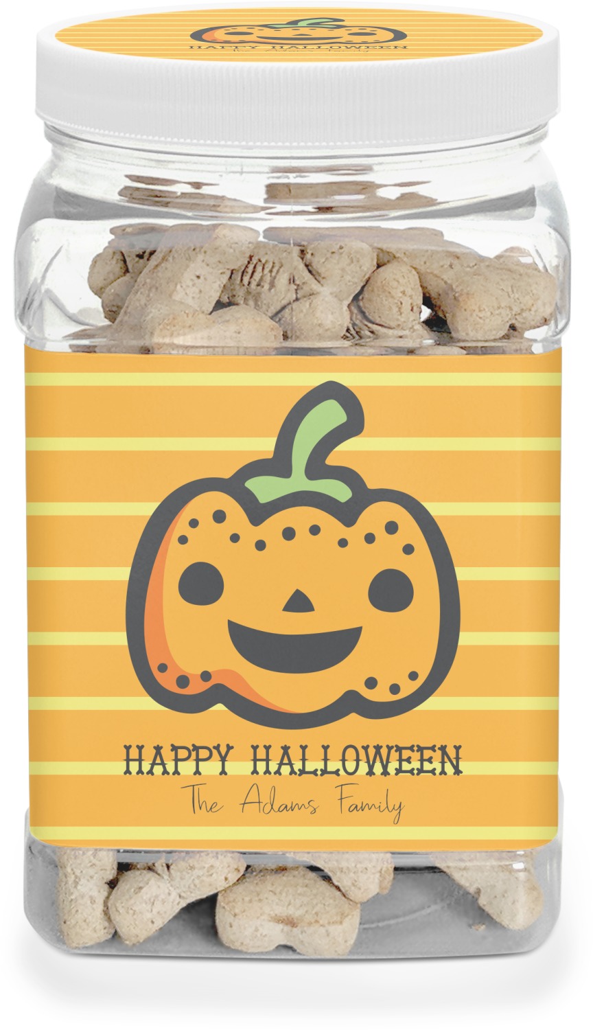 This half gallon jar, made from a sturdy plastic, is the perfect way to keep treats from any naughty pet paws, while still keeping them ready on hand for when your pup performs an impressive trick. This dog cookie jar features a screw-on, white lid that displays your personalized design on a vinyl sticker. We apply another customized sticker that wraps around the front and sides of the jar. Our dog treat jar also has indentations on the rear ends of the sides, which allows for convenient handling, and its square frame allows for easy storage.