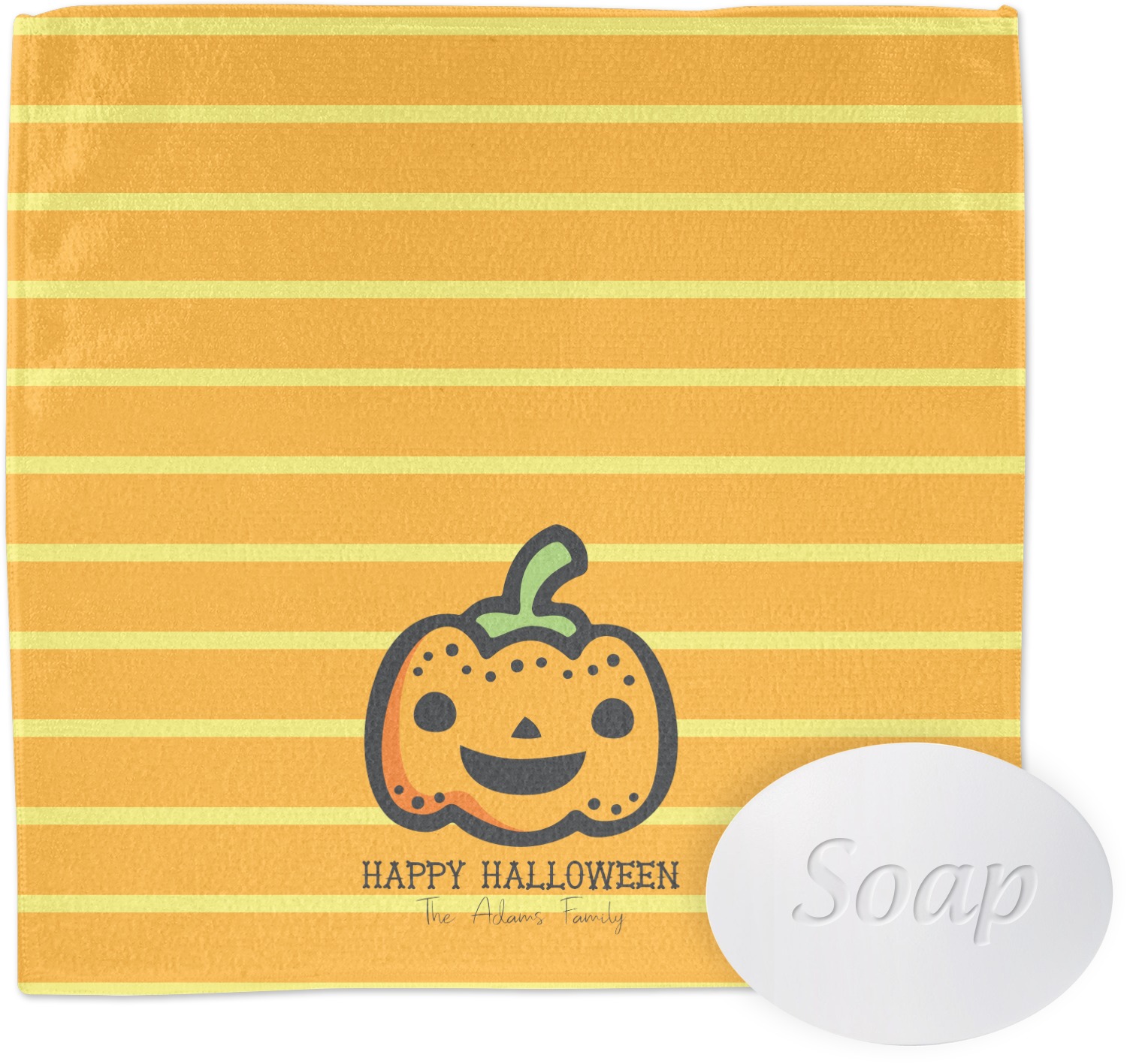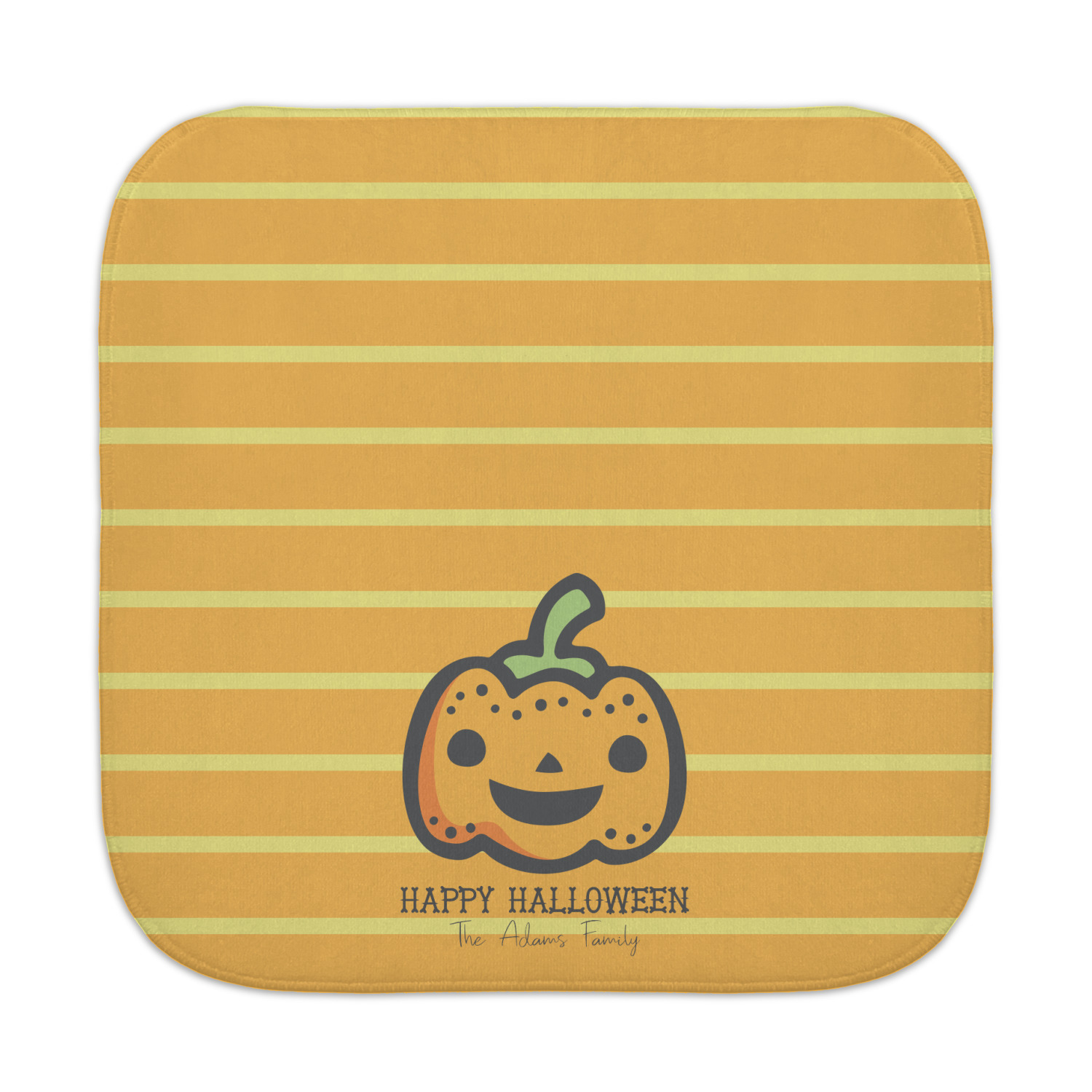 The design features a fun-loving pumpkin as the main focus. He even has a cute little smile on his face that will make you smile right back. The background is a subtle striped one with yellow and orange as the colors. Your personalization or greeting goes directly underneath your pumpkin friend. The coordinating design even has a cute little ghost who thinks that you are "bootiful" and "spooktacular."
