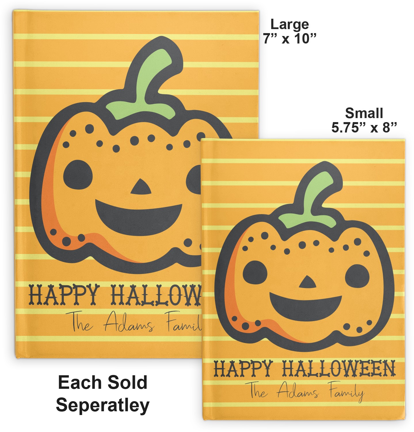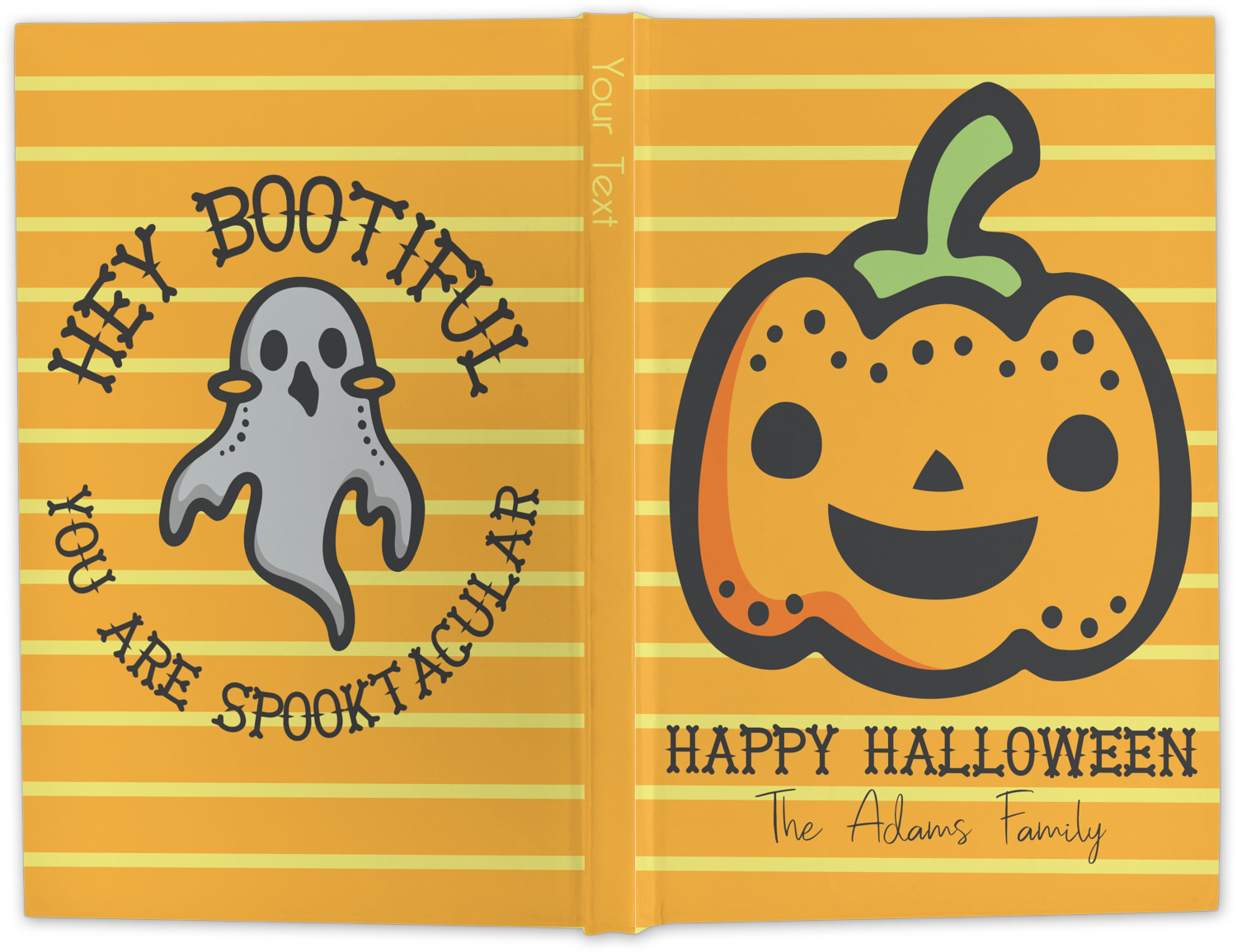 The design features a fun-loving pumpkin as the main focus. He even has a cute little smile on his face that will make you smile right back. The background is a subtle striped one with yellow and orange as the colors. Your personalization or greeting goes directly underneath your pumpkin friend. The coordinating design even has a cute little ghost who thinks that you are "bootiful" and "spooktacular."