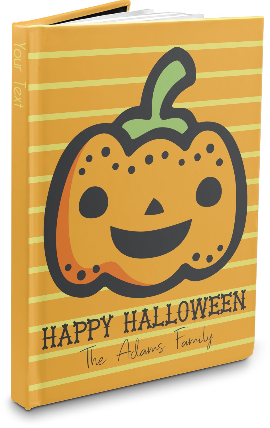 The hardcover of this personalized journal is covered with a smooth, matte, laminate coating. The unique laminate of the covers gives the hardcover notebook a smooth, sleek feel. Filled with 75, lined, white pages, this hardbound notebook has enough room for your reminders and notes. For your convenience, the pages have been perforated, which guarantees an easy tear and removal. Your customization is printed across the entire cover of the book, while the interior is black in color.