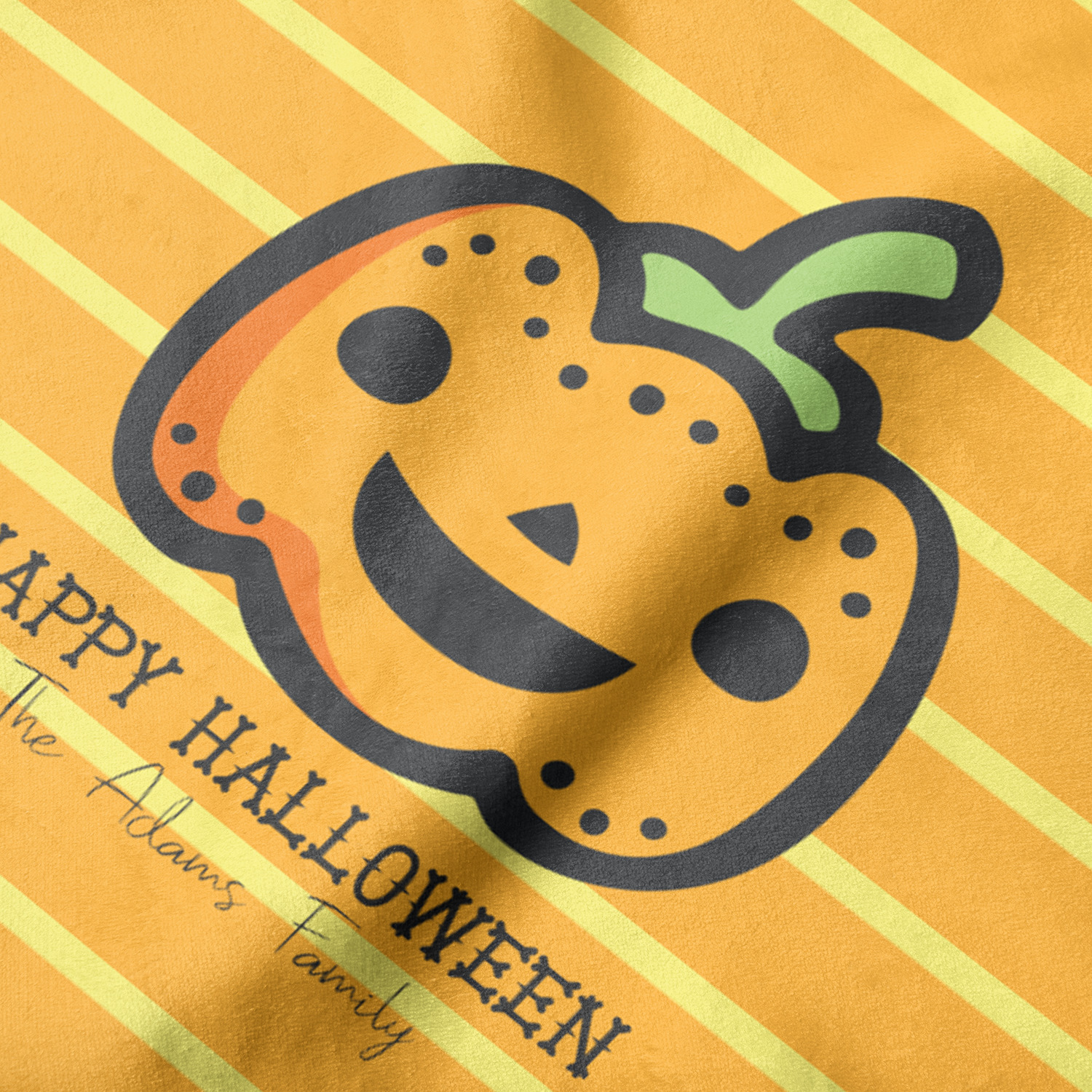The design features a fun-loving pumpkin as the main focus. He even has a cute little smile on his face that will make you smile right back. The background is a subtle striped one with yellow and orange as the colors. Your personalization or greeting goes directly underneath your pumpkin friend. The coordinating design even has a cute little ghost who thinks that you are "bootiful" and "spooktacular."