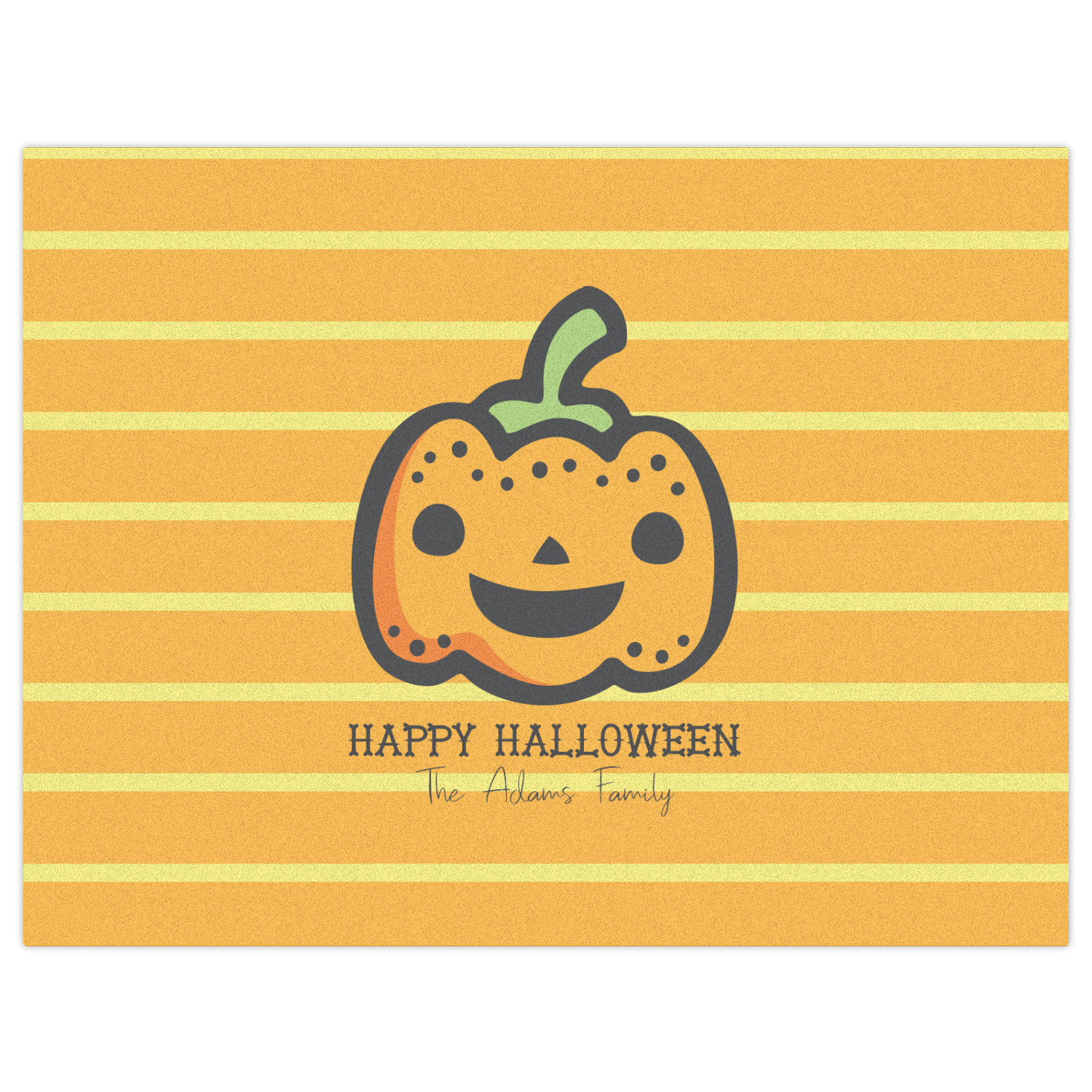 The design features a fun-loving pumpkin as the main focus. He even has a cute little smile on his face that will make you smile right back. The background is a subtle striped one with yellow and orange as the colors. Your personalization or greeting goes directly underneath your pumpkin friend. The coordinating design even has a cute little ghost who thinks that you are "bootiful" and "spooktacular."