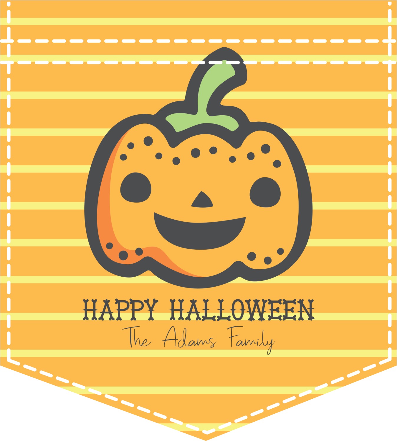The design features a fun-loving pumpkin as the main focus. He even has a cute little smile on his face that will make you smile right back. The background is a subtle striped one with yellow and orange as the colors. Your personalization or greeting goes directly underneath your pumpkin friend. The coordinating design even has a cute little ghost who thinks that you are "bootiful" and "spooktacular."