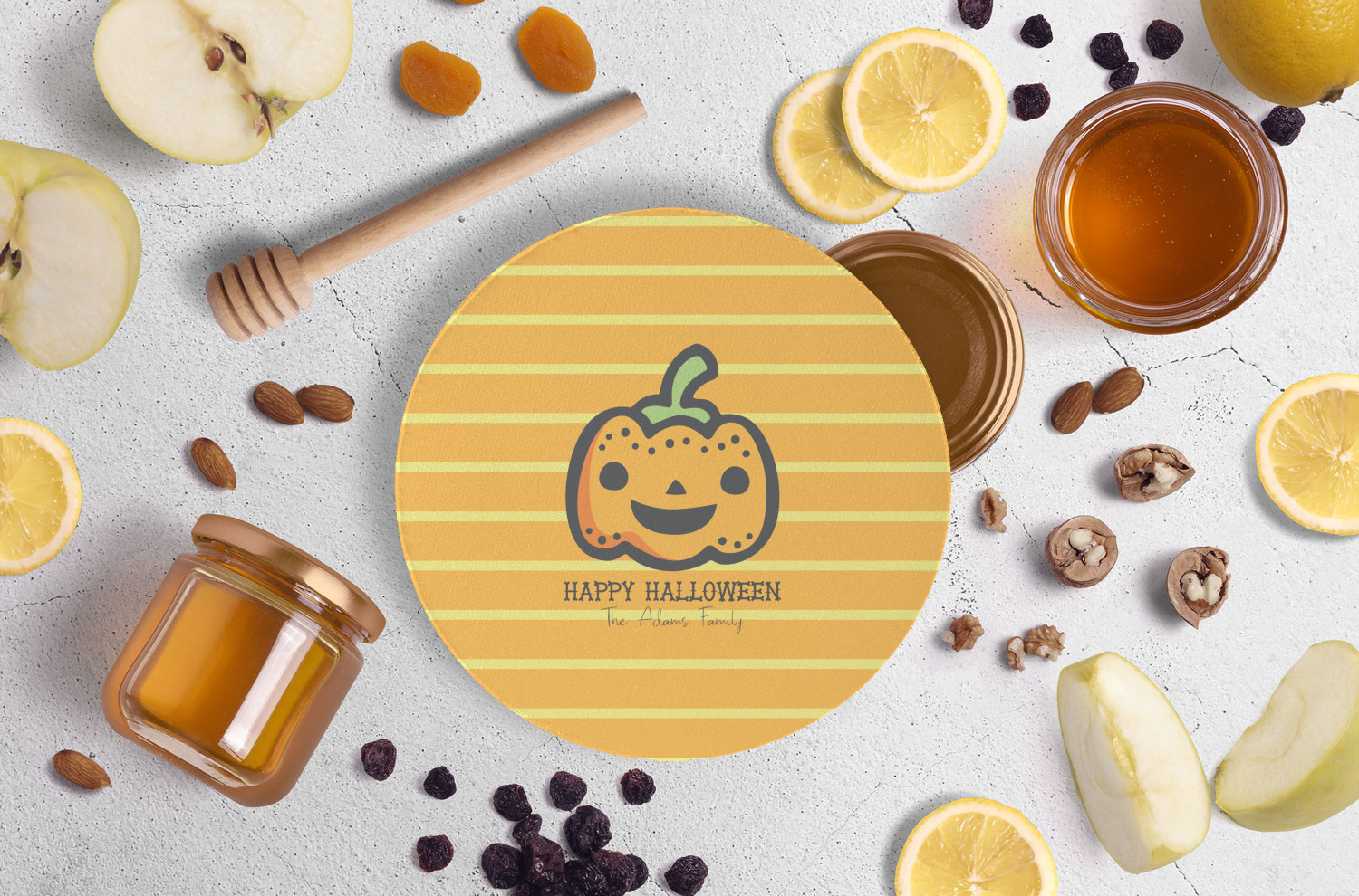 The design features a fun-loving pumpkin as the main focus. He even has a cute little smile on his face that will make you smile right back. The background is a subtle striped one with yellow and orange as the colors. Your personalization or greeting goes directly underneath your pumpkin friend. The coordinating design even has a cute little ghost who thinks that you are "bootiful" and "spooktacular."
