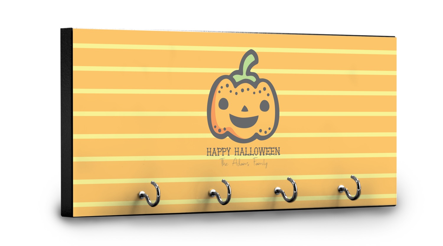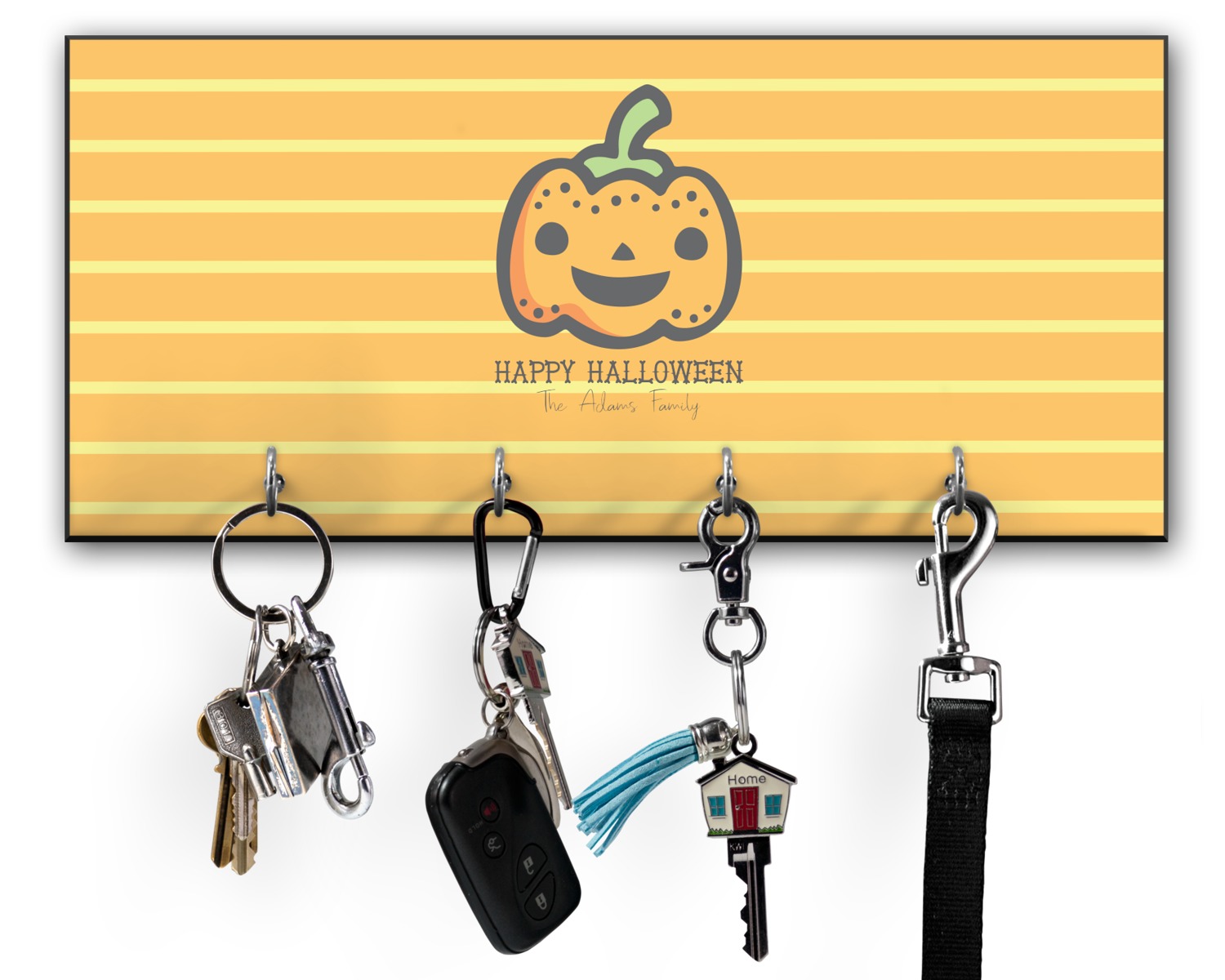 This 11" x 5" key hanger is made of sturdy wood and has four metal hooks lining the bottom. This is the perfect size for a family with several drivers. Not only can you hang keys on it though, but pet leashes and other small items. The board is black on the sides and back and is printed with the design of your choice on the front.