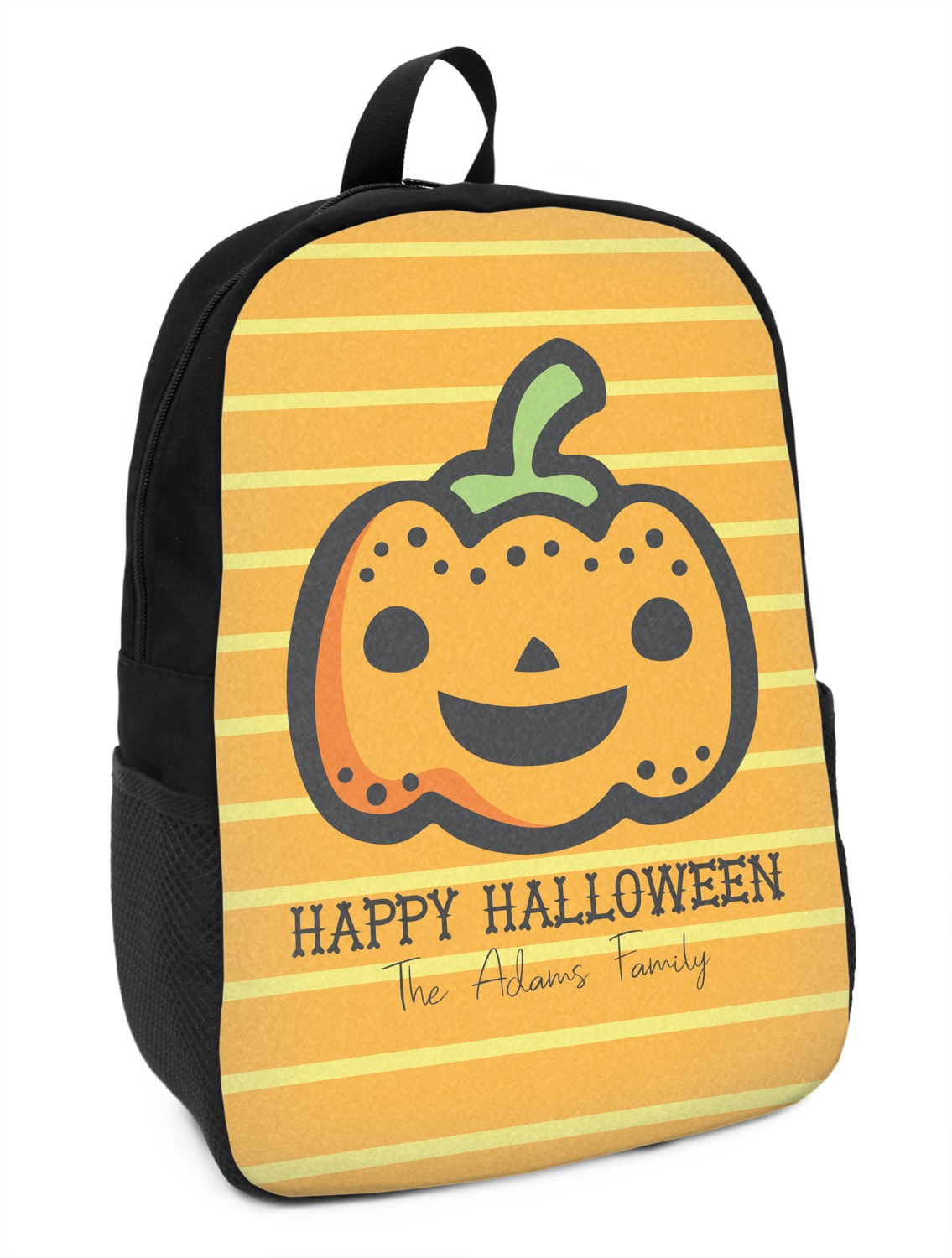 These small backpacks are made of a durable black canvas material with your personalization right on the front. The two shoulder straps are padded and easily adjustable. The bag itself measures at about 11" W x 15" H x 5" D. It's the perfect size for elementary aged kids or adults who want a smaller backpack. On the top of the bag you will find a handle to hang or carry your backpack by as well as a large zipper closure to keep all of your belongings safe inside. On each side of your backpack is a mesh pocket for a small item or water bottle. Inside your backpack you will find a spacious area with a small zipper pocket and a padded laptop slot that will fit up to a 13" laptop (13" being very snug). This is the perfect bag for any student that needs a couple books and their laptop with them at all times. It also works great as a carry on for traveling!