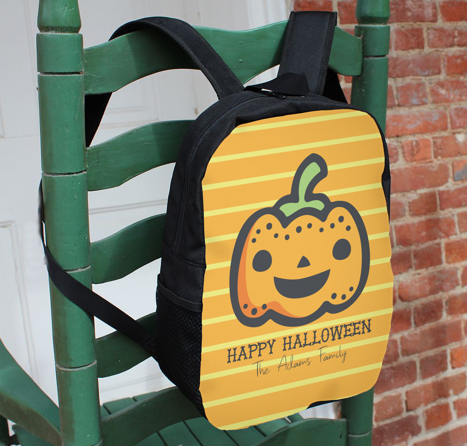 The design features a fun-loving pumpkin as the main focus. He even has a cute little smile on his face that will make you smile right back. The background is a subtle striped one with yellow and orange as the colors. Your personalization or greeting goes directly underneath your pumpkin friend. The coordinating design even has a cute little ghost who thinks that you are "bootiful" and "spooktacular."