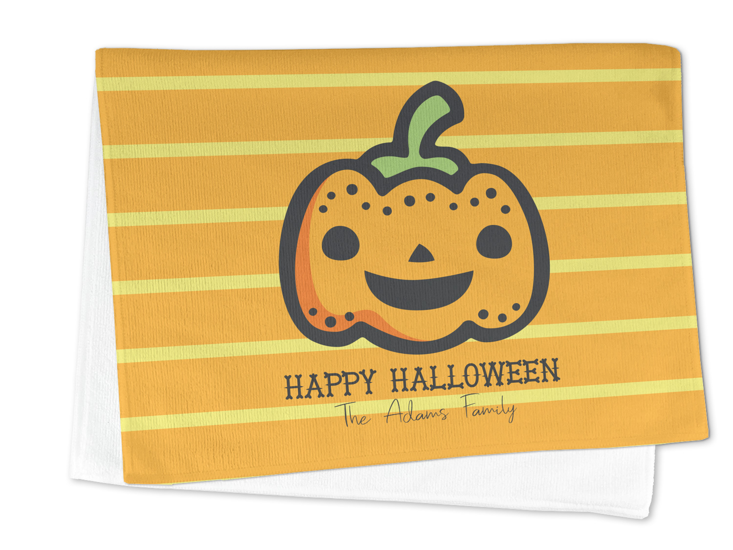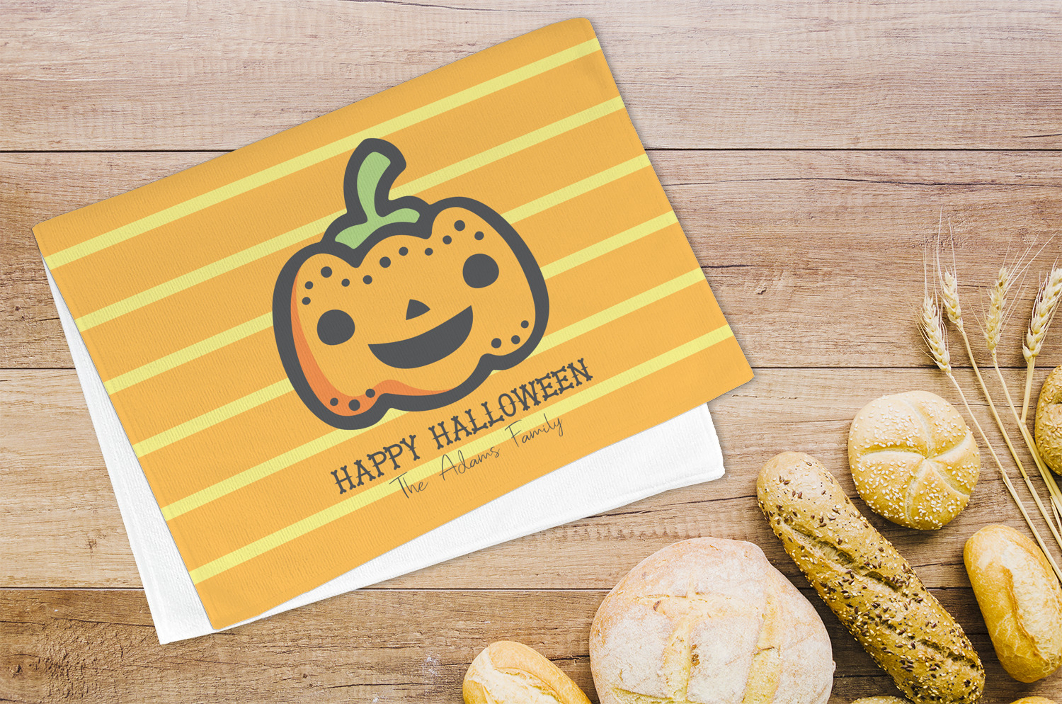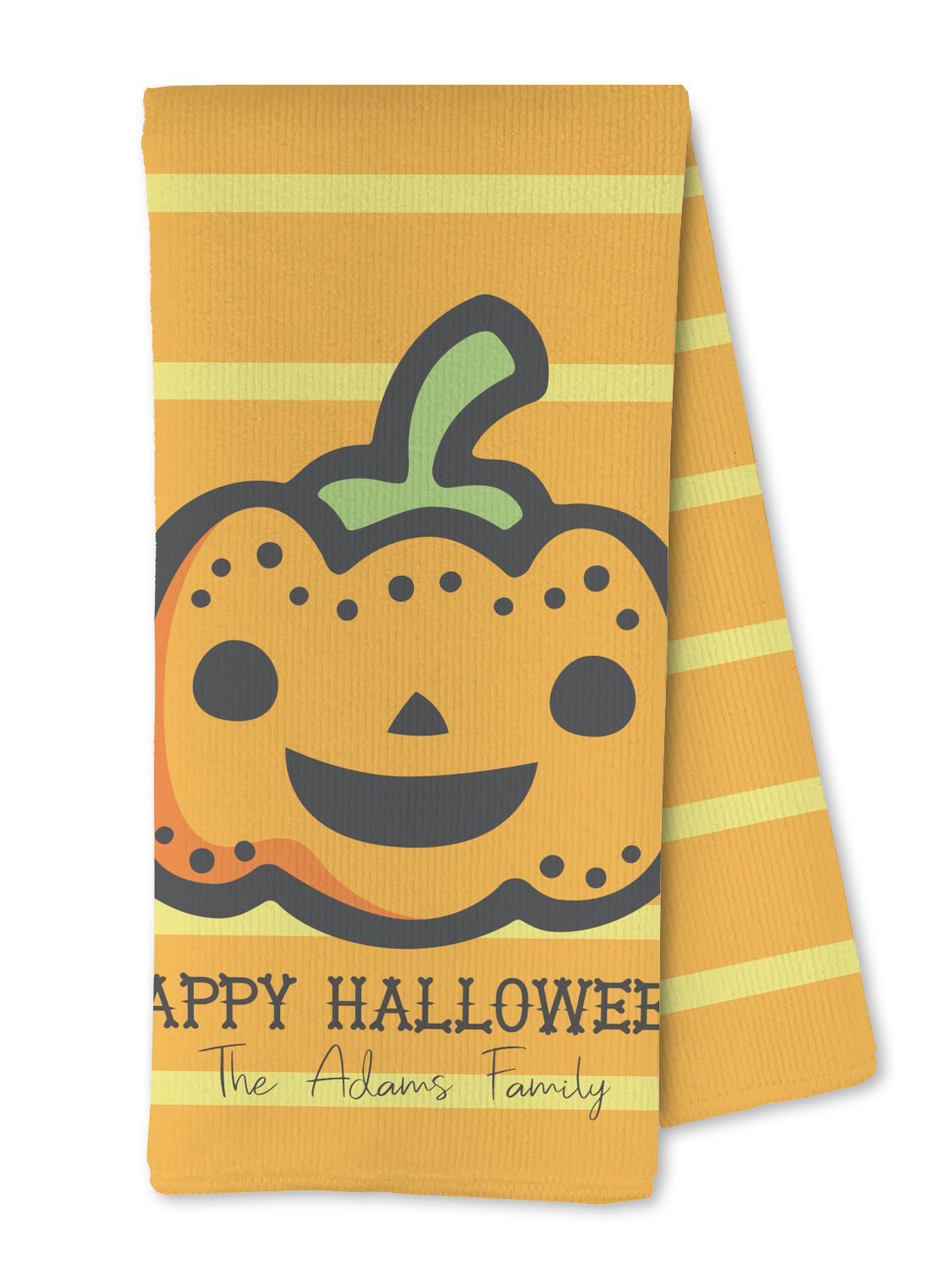 The design features a fun-loving pumpkin as the main focus. He even has a cute little smile on his face that will make you smile right back. The background is a subtle striped one with yellow and orange as the colors. Your personalization or greeting goes directly underneath your pumpkin friend. The coordinating design even has a cute little ghost who thinks that you are "bootiful" and "spooktacular."