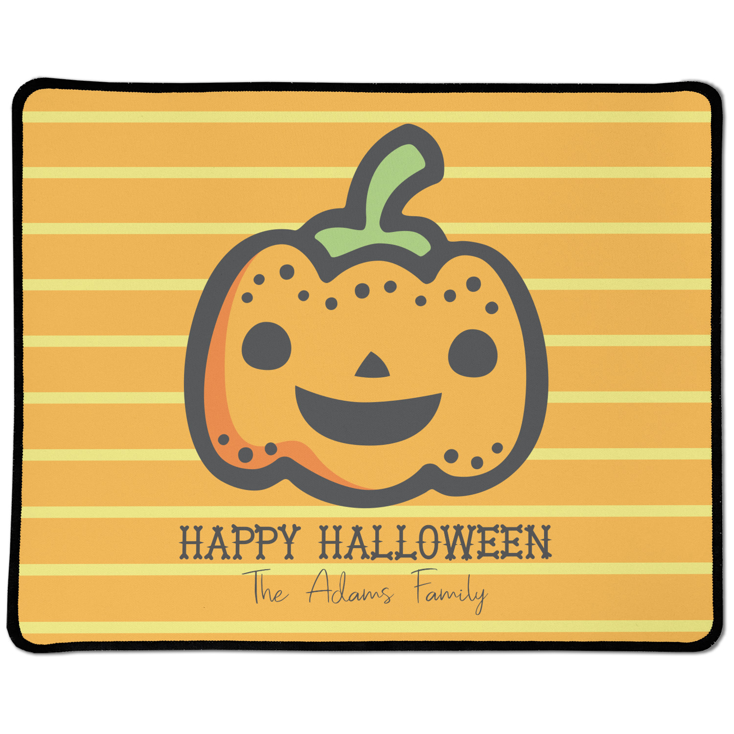 The design features a fun-loving pumpkin as the main focus. He even has a cute little smile on his face that will make you smile right back. The background is a subtle striped one with yellow and orange as the colors. Your personalization or greeting goes directly underneath your pumpkin friend. The coordinating design even has a cute little ghost who thinks that you are "bootiful" and "spooktacular."