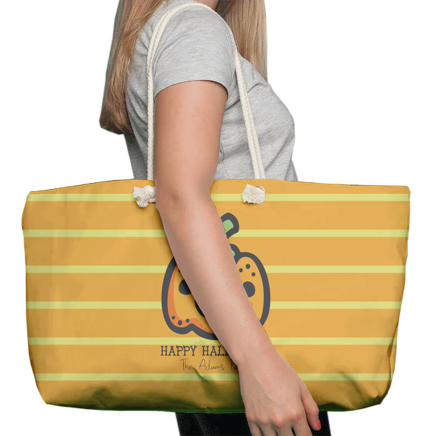 Our oversized weekender tote with rope handles is perfect for your weekend at the beach or on the town. This large tote are 24" W X 13" H, with a 5" gusset and a 27" thick rope handles with a knot that is put through a grommeted brass hole.