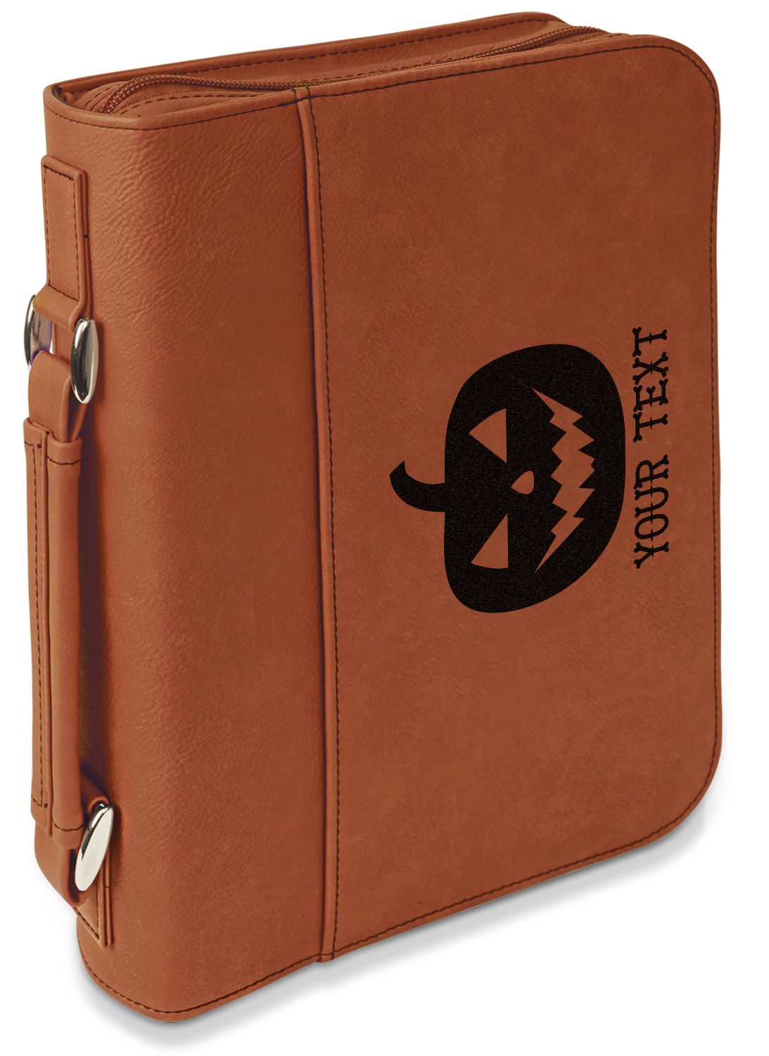 These book covers are fabricated from a fine leatherette in a warm, cognac shade of brown. A wide pocket spans across the front of the book jacket [2,400] and can store any loose papers or notes that you wish to keep. The interior of this personalized Bible cover includes slots on both sides to house the covers of your Bible, and keep it in place. The inside of the spine has a small elastic band to secure a pen. A zipper lines three sides of the cover, while the fourth side features a reinforced handle that allows for easy transport of your enclosed book.